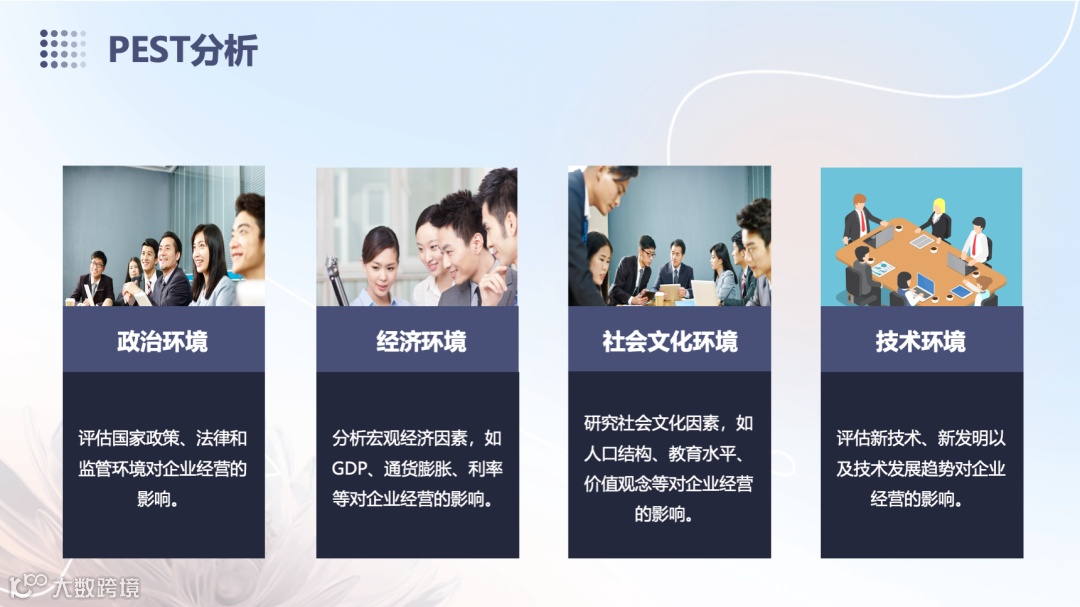 关键要素:行业监管政策(如医药企业需符合GMP认证)、税收政策(如新能源车企享受补贴)、国际贸易壁垒(如欧盟GDPR数据合规要求)。