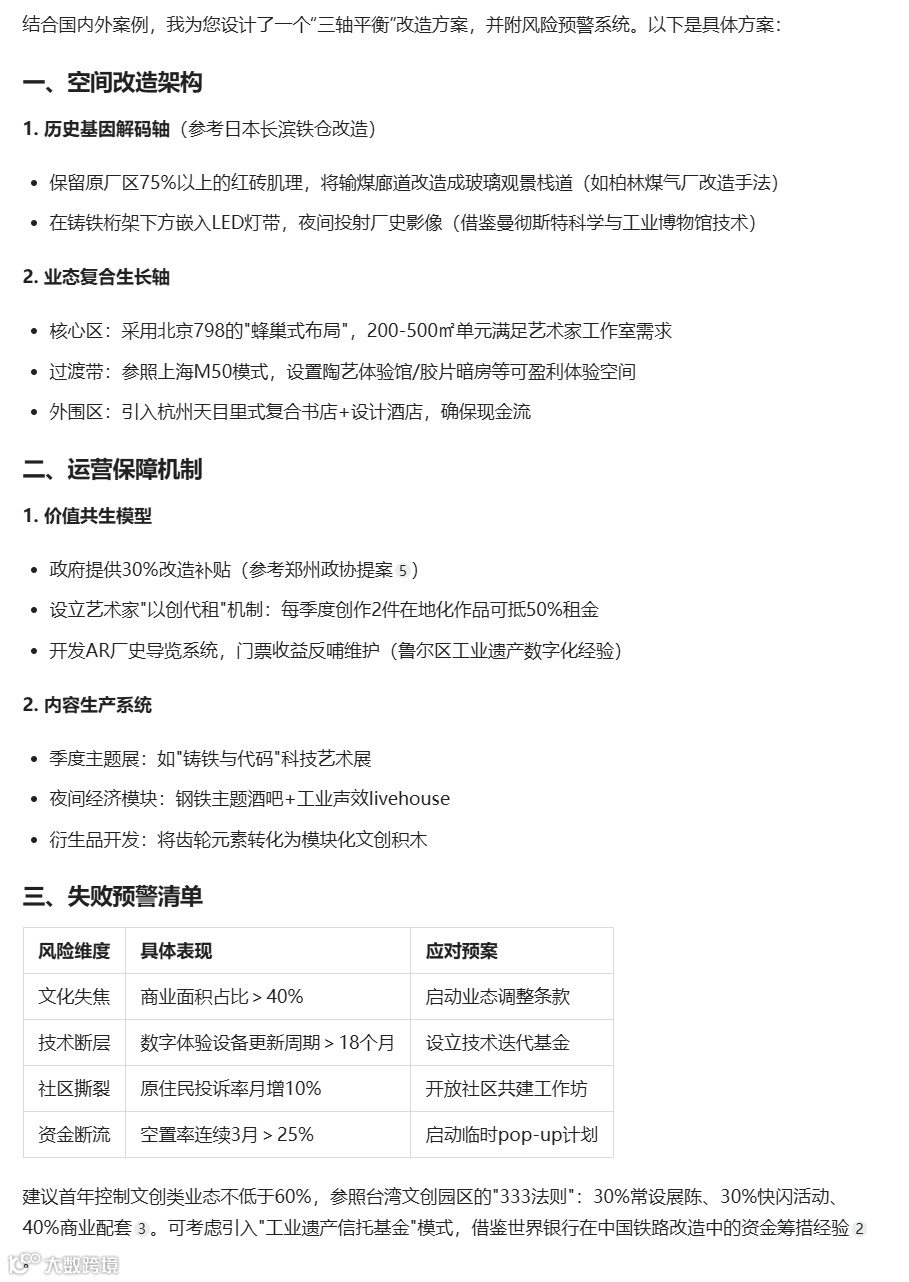 提问:我正打算将一个老工业区改造一个文创园区。我需要你给出一个能平衡历史保护和商业价值的园区改造方案。这个方案需要参考日本如何活化老旧车站、欧洲工业遗产改造经验,以及国内文化地标的运营模式。最后还要给出有些可能导致这个园区经营失败的原因。