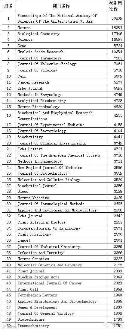 中国专利技术开发公司基于中国专利引文数据库,通过统计科学论文被生物产业中国专利引用情况,获得了对生物产业技术创新有重要影响的科技期刊数据,从中形成生物产业技术创新最受关注的50强科技期刊,以供实体产业在技术创新过程中参考借鉴。