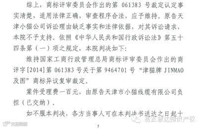 我司自2012年起代理天津天缆集团异议天津市小猫线缆有限公司第九类“津猫+图形”商标,该案件经历了商标局的商标异议、商标评审委员会的商标异议复审及北京市第一中级人民法院的行政诉讼,截止2015年10月,该案件算是告一段落,法院支持商评委的审查意见,撤销对方天津市小猫线缆有限公司的商标注册!