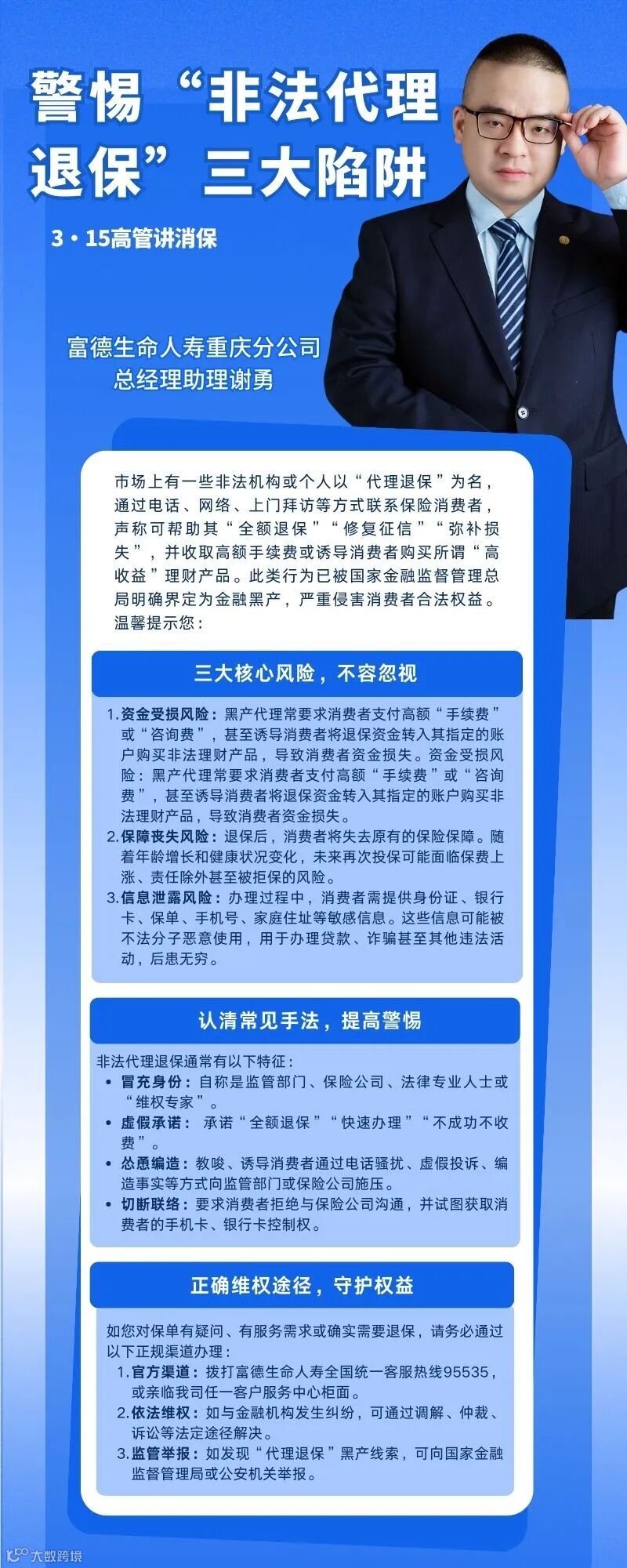 富德生命人寿重庆分公司2026年“3·15”教育宣传活动丨高管说消保:警惕“非法代理退保”三大陷阱
