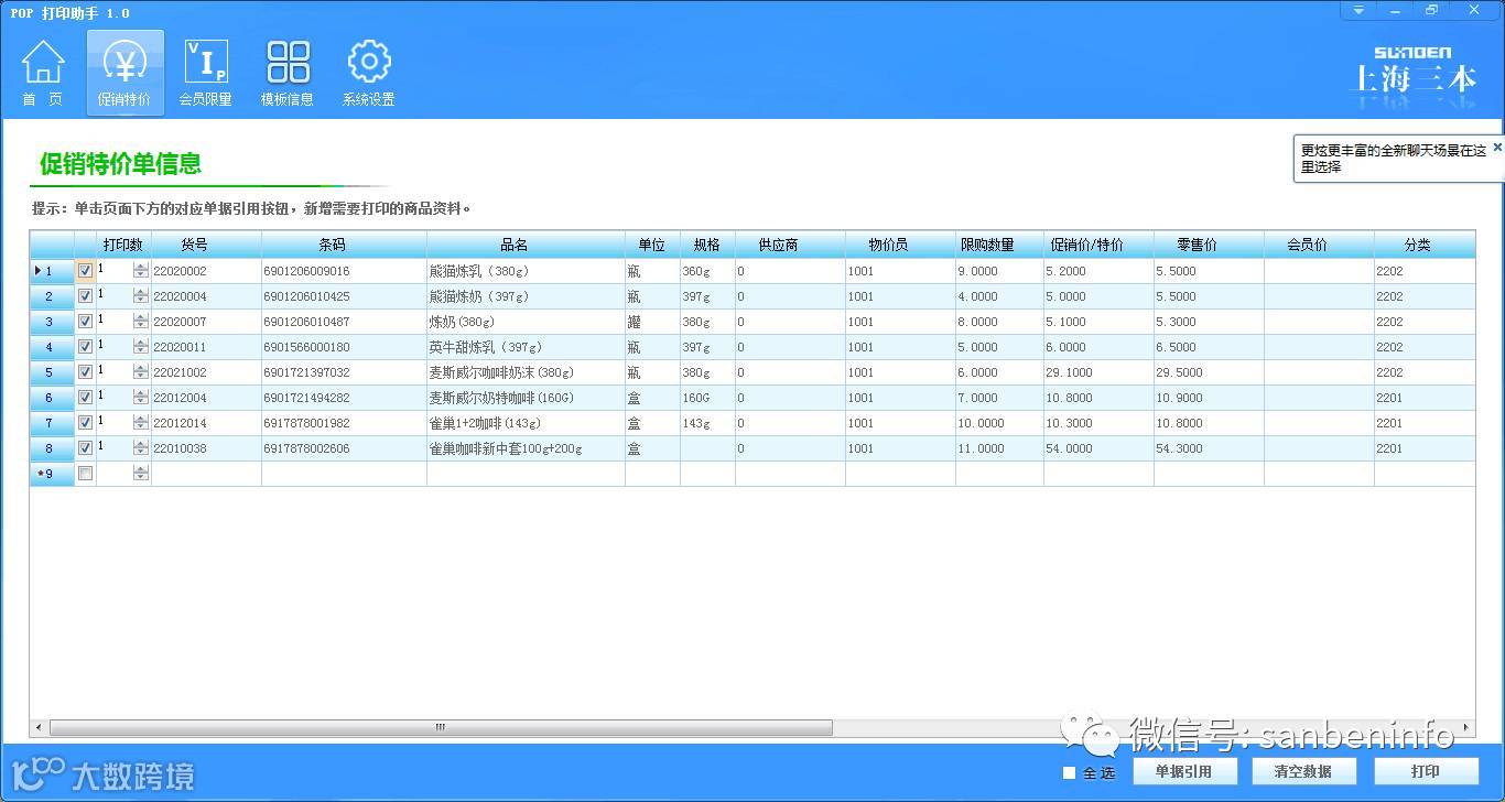2、三本POP支持全部促销海报的打印,不局限在特价的海报