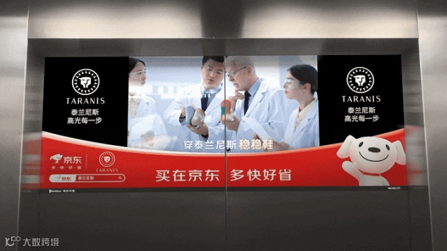 在电梯场景中,受众普遍目视前方。因此,梯影大屏牢牢占据视线C位,潜移默化实现有效传播,让泰兰尼斯稳稳鞋的稳定特点深入人心。
