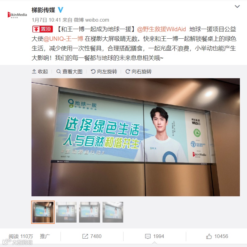 梯影还将线上与线下打通,积极参与微博公益话题,与大V联名互动。例如,助力野生救援推广系列科普纪录片《海龟奇援》,共同为野生动物发声,呼吁大家保护海洋环境。还与明星共同接力#地球一援#项目,单条微博点赞数破万,阅读量超过110万,线上宣传效果和线下同样惊人。