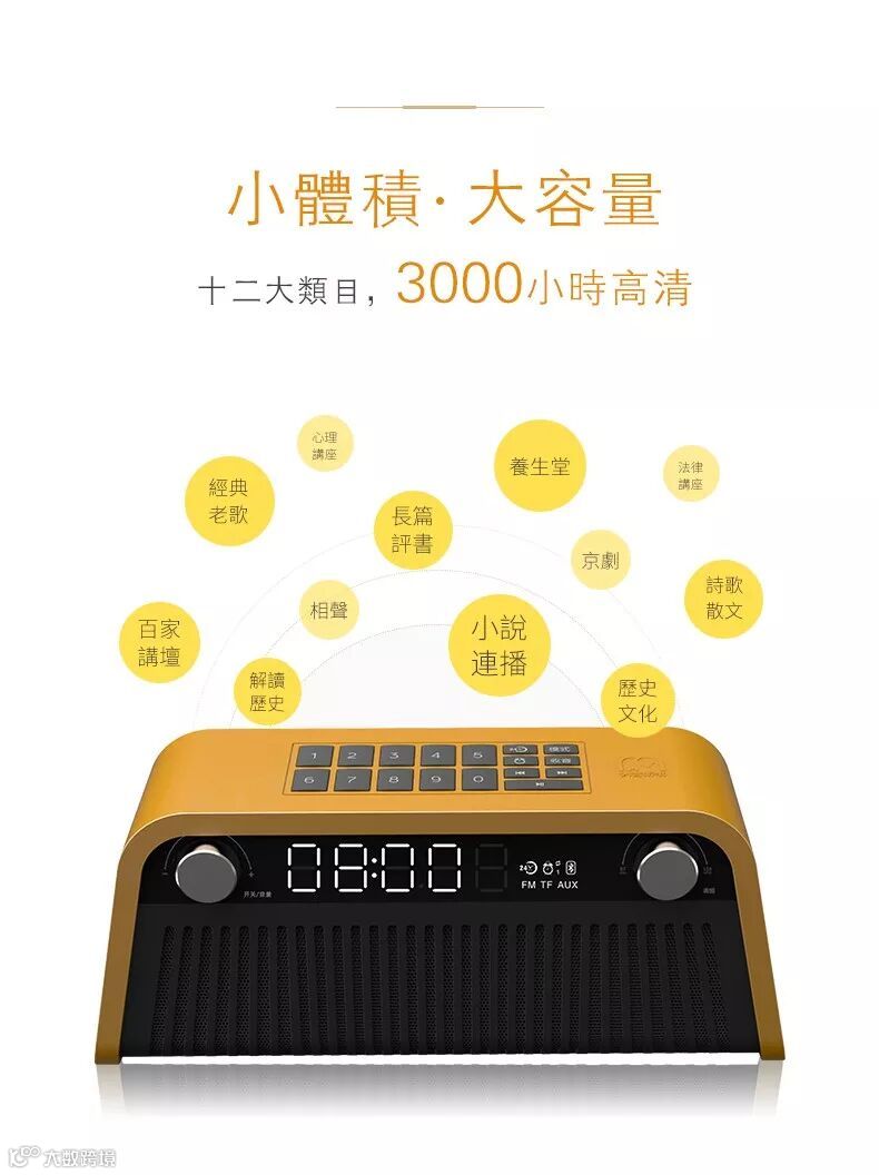 金色年華老人聽書機內含3000小時正版經典音頻,涵蓋百家講壇、解讀歷史、歷史文化、小說連播、詩歌散文、長篇評書、相聲、京劇、經典老歌、養生堂、法律講座和心理講座等12大類老人喜愛的內容。
