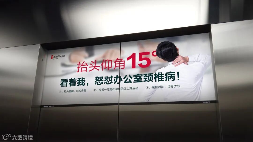 研究表明,低头60度相当于脖子上骑了一个8岁小孩。而梯影媒体的位置处于电梯内门正上方,当乘梯人观看媒体画面时,会暂时放下手机,自然而然地抬头,仰角刚好保持在15度,可以有效缓解肩颈劳累。“看着我,怒怼颈椎病!”虽然只是短暂的十几秒,却在提醒人们适当放下手机,劳逸结合。