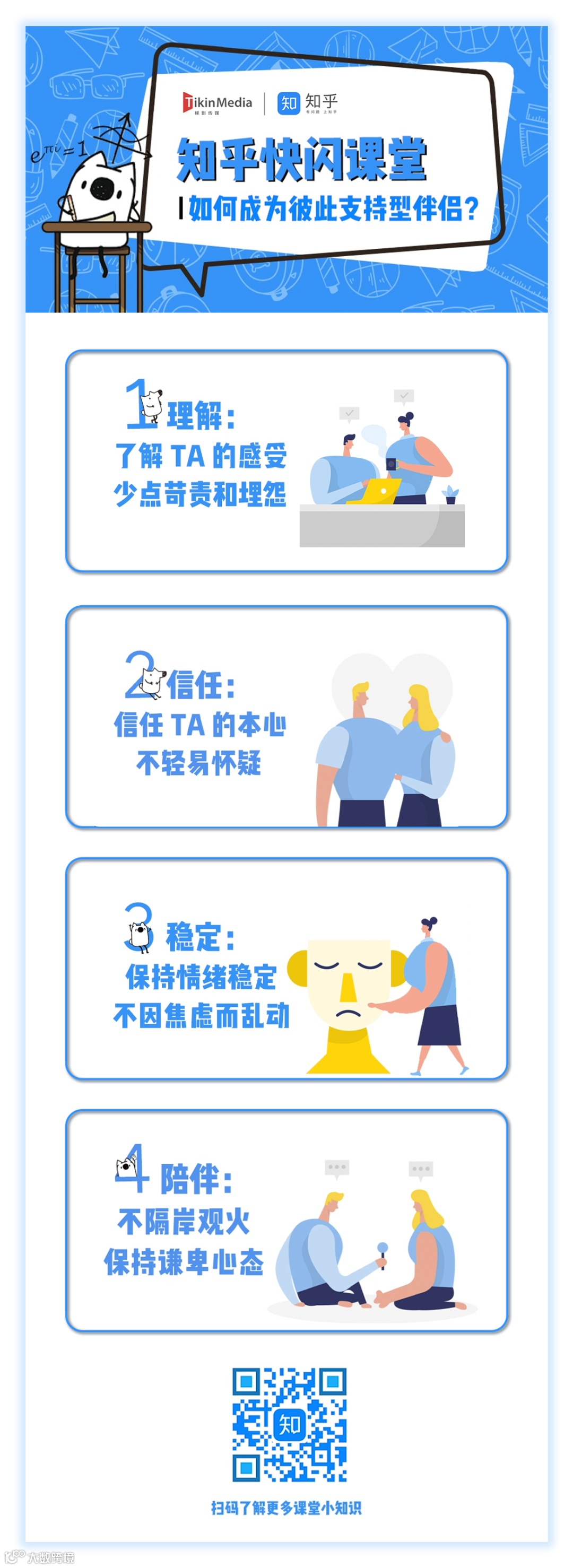 不同于其他类型的产品广告,知乎在梯影的上刊画面采用了科普形式,针对“如何成为彼此支持型伴侣”的问题,精选出几个答案,凸显出知乎的使命——让每个人高效获得可信赖的解答。
