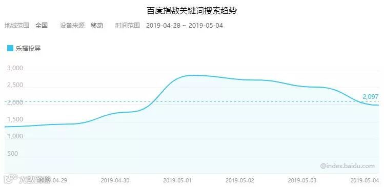 数据显示,广告投放展示期间,乐播投屏的百度指数持续走高,在5月初远高于平均值。据乐播投屏市场总监陈拓透露,本次在北京、上海、广州、深圳各城市的梯影媒体上投放视频广告后,App下载量猛增近2000万。