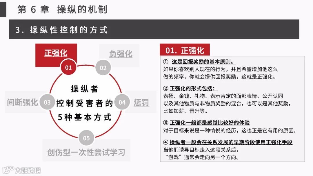 心理机制:利用正强化(奖励)、负强化(停止负面体验)、间断强化(随机奖励成瘾)等手段强化操控。