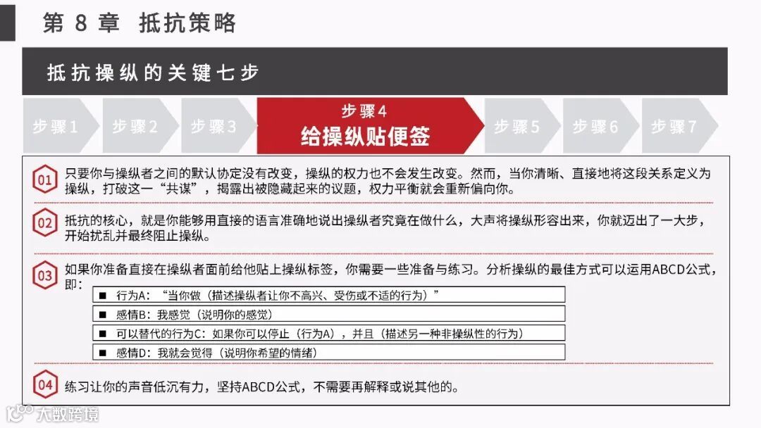 贴标签揭露操纵:用ABCD公式明确操纵行为(行为A→感受B→替代行为C→新感受D),直接点破对方动机。