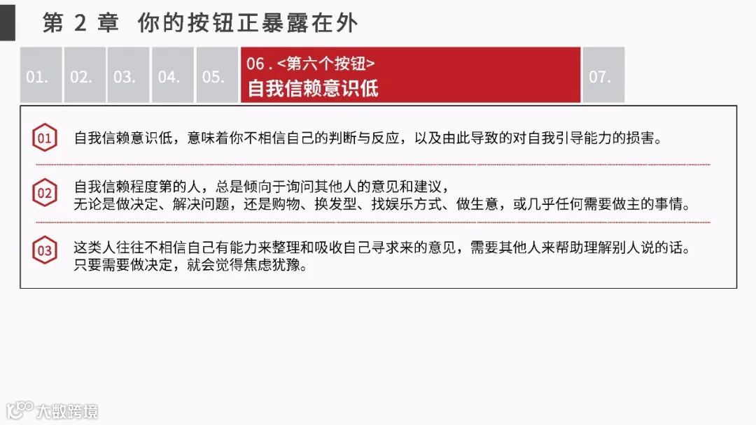 低自我信赖:怀疑自身判断,依赖他人决策;