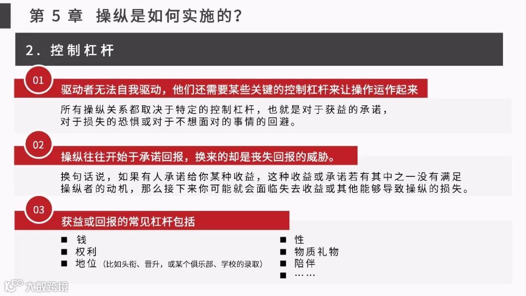 控制杠杆:金钱、权力、地位、爱、陪伴等资源的获益承诺或损失威胁。