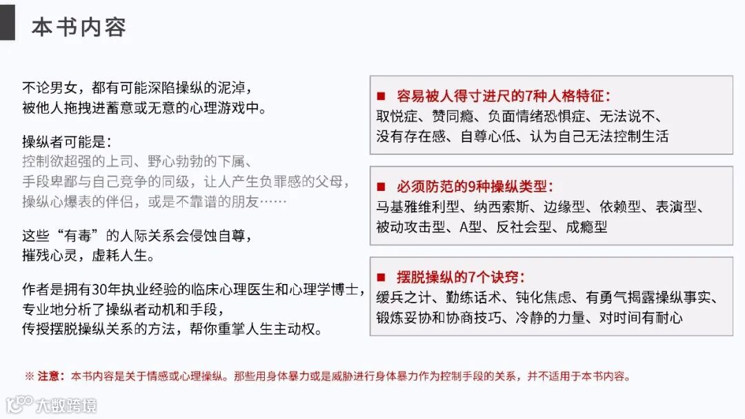 该书不仅揭露了操纵行为的隐蔽逻辑,更提供了从识别到抵抗的系统方法论。其核心观点强调:人生的主导权源于清晰的自我认知、坚定的边界意识,以及对操控行为的清醒反击。