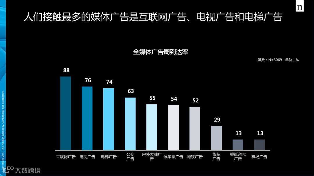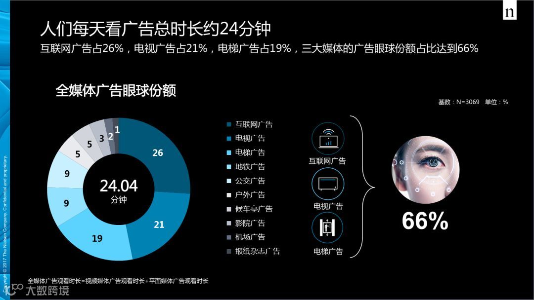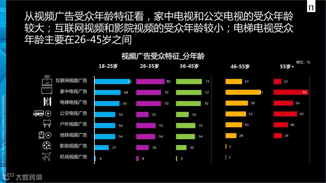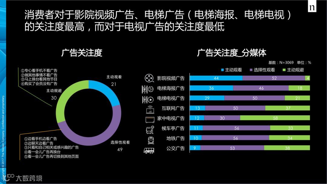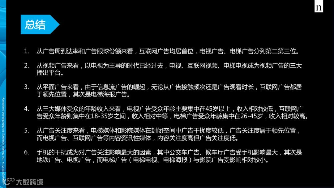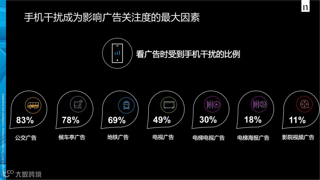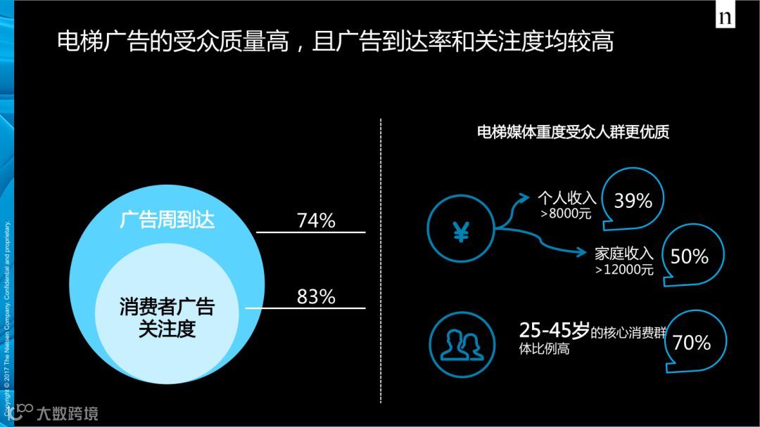 全球最大的研究公司尼尔森日前发布了《中国广告关注度研究》报告,其中互联网广告、电视广告、电梯广告成为中国三大广告平台,其受众偏重也相对不同。其中,电梯广告的受众质量高,且广告到达率达到了74%,并且电梯媒体在封闭空间中广告干扰度较低,广告关注度居于领先位置高达83% ,在全媒体和视频广告眼球份额也占据了19%。