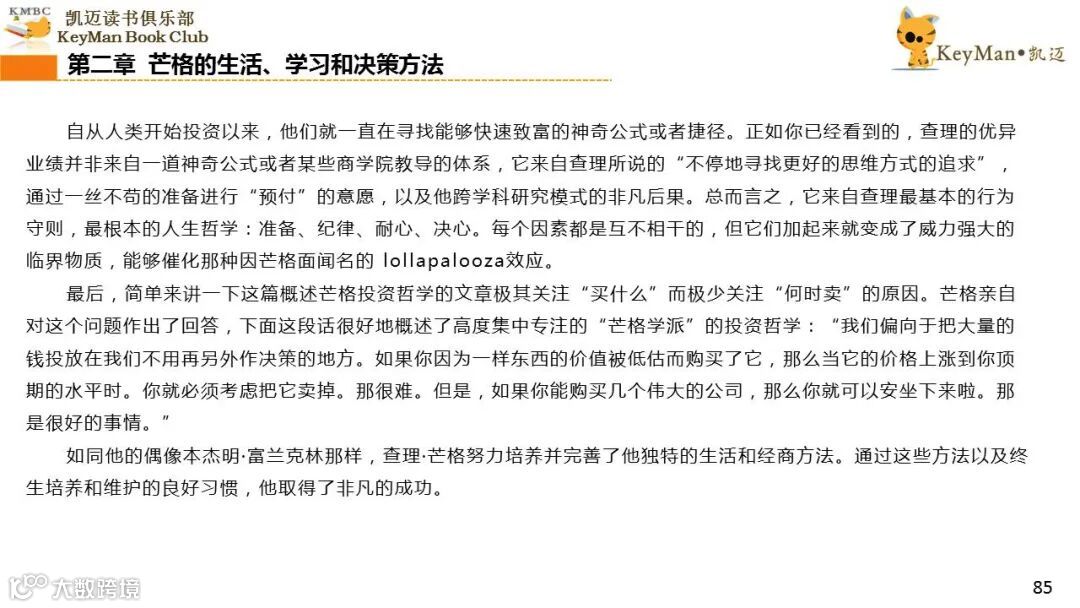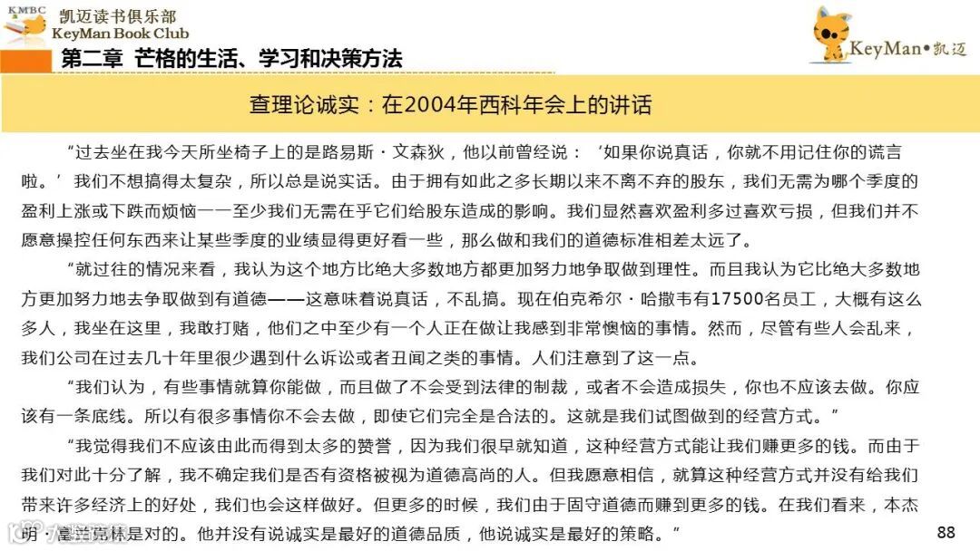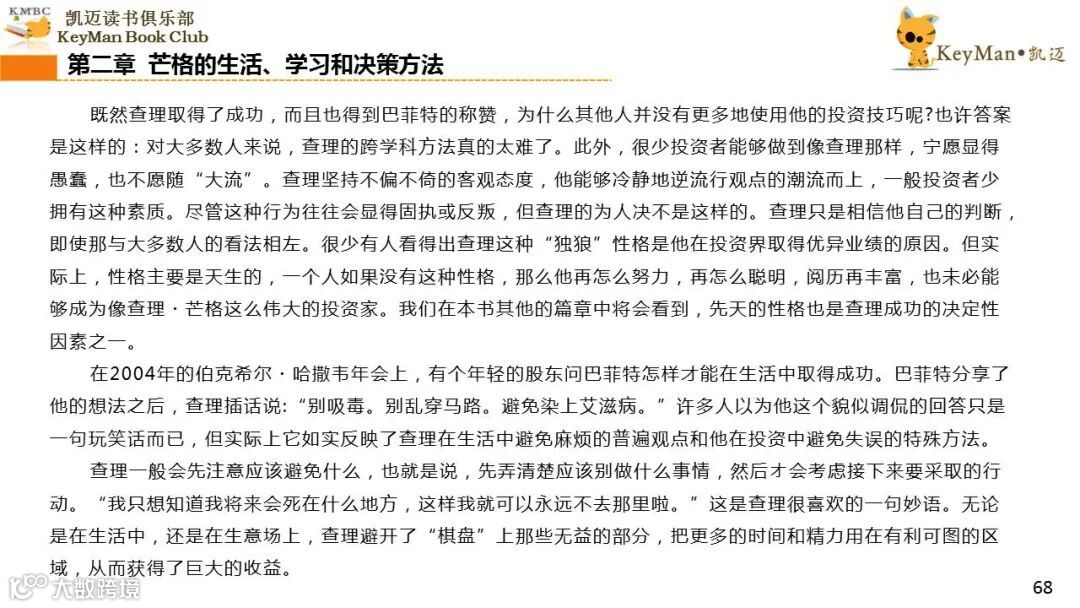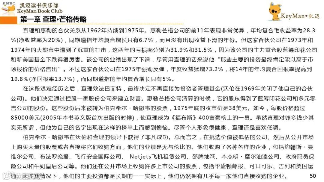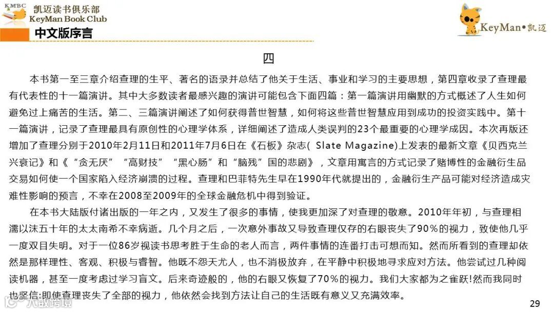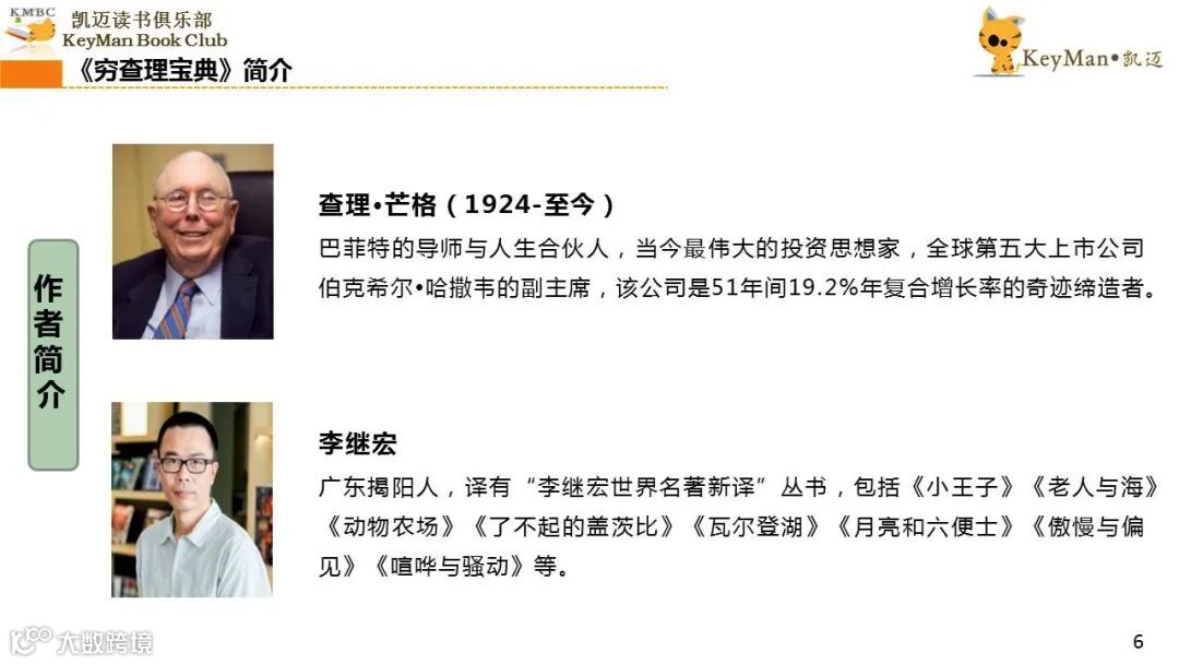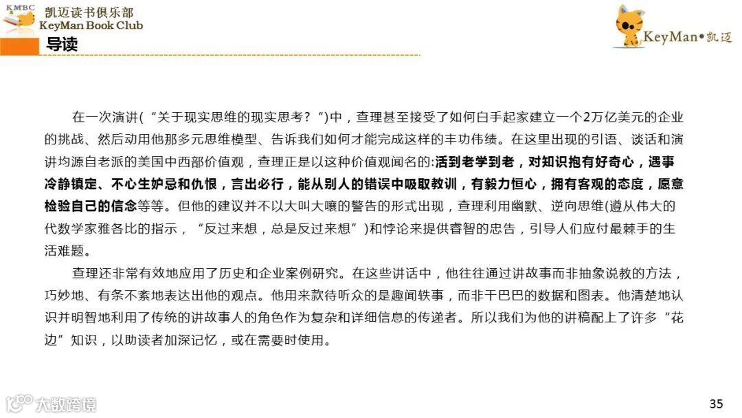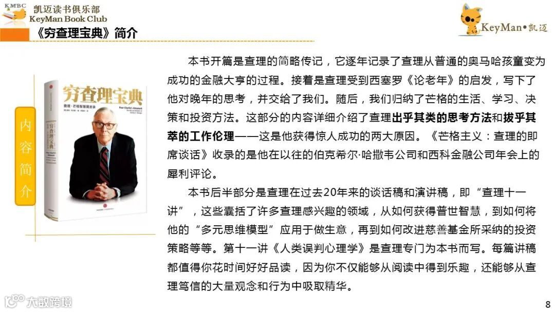 《穷查理宝典》收录了查理过去20年来主要的公开演讲,书中十一篇讲稿全面展现了这个传奇人物的聪明才智。贯穿《穷查理宝典》全书的是芒格展示出来的聪慧、机智,其令人敬服的价值观和深不可测的修辞天赋。