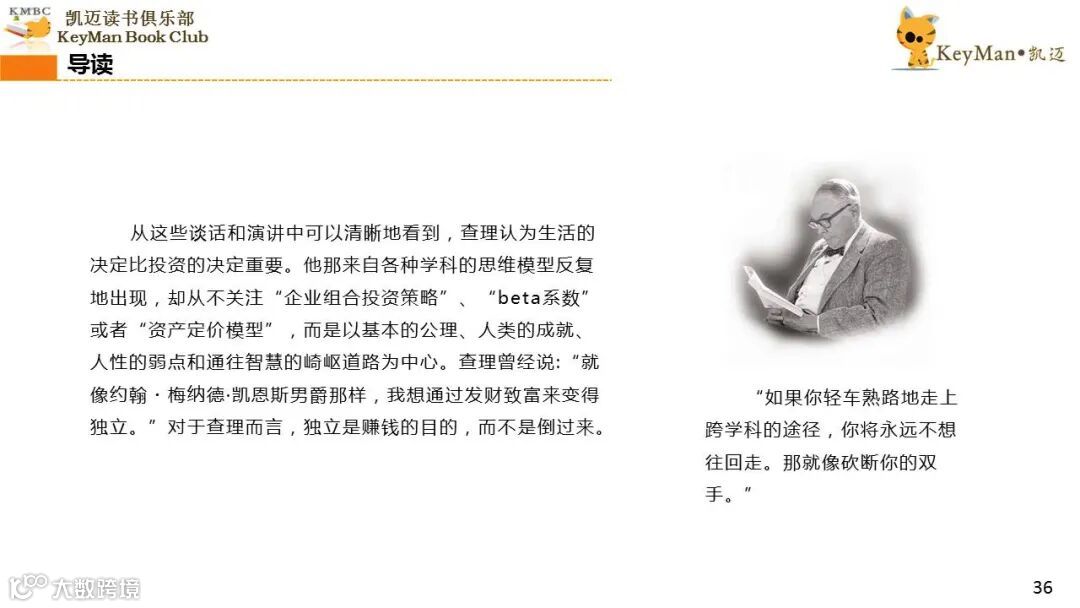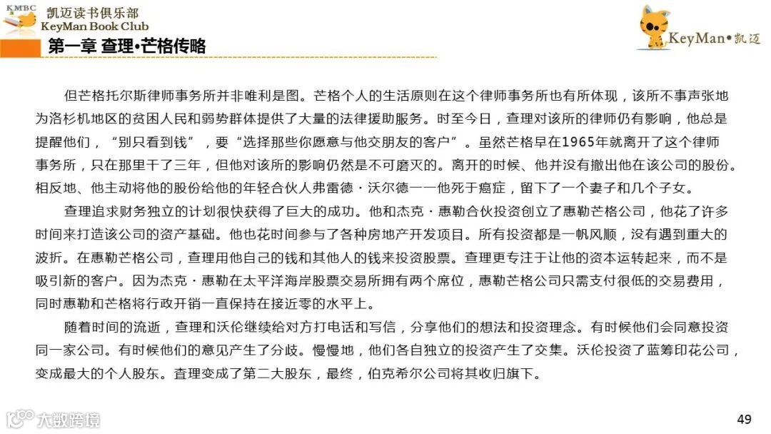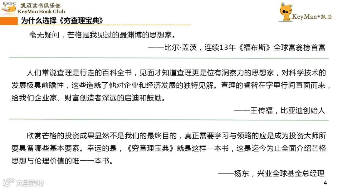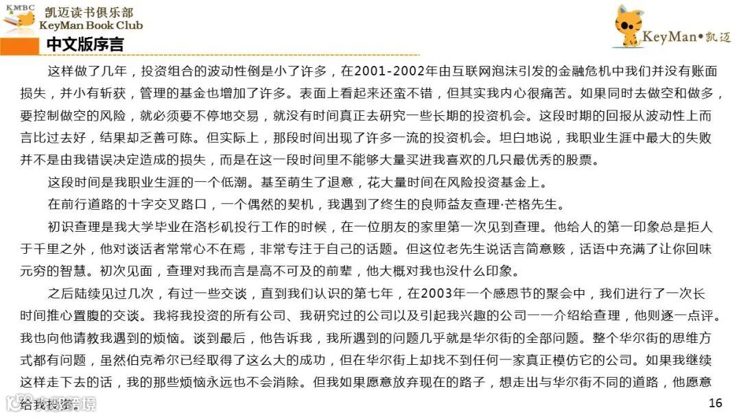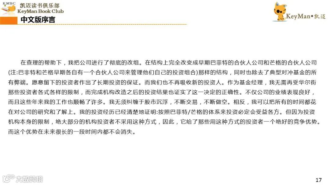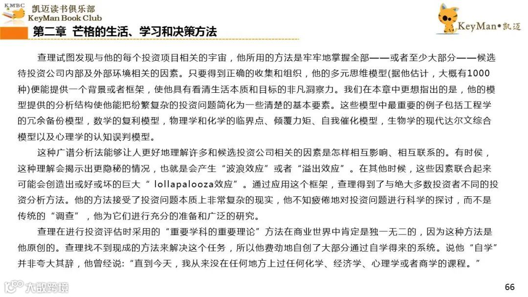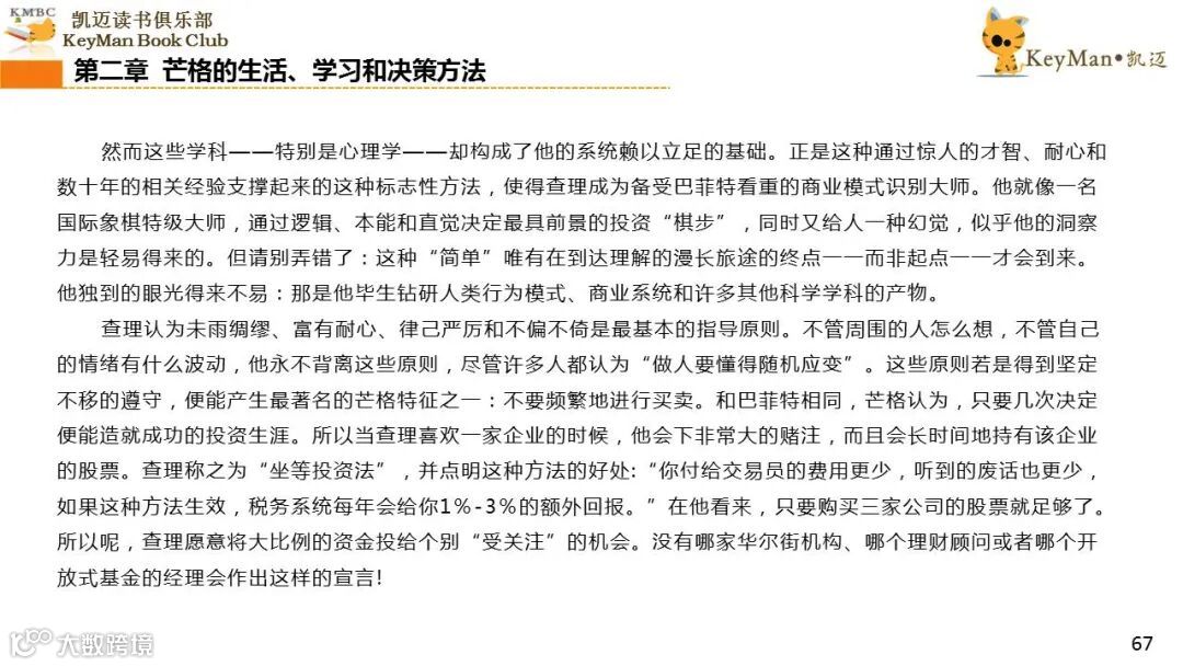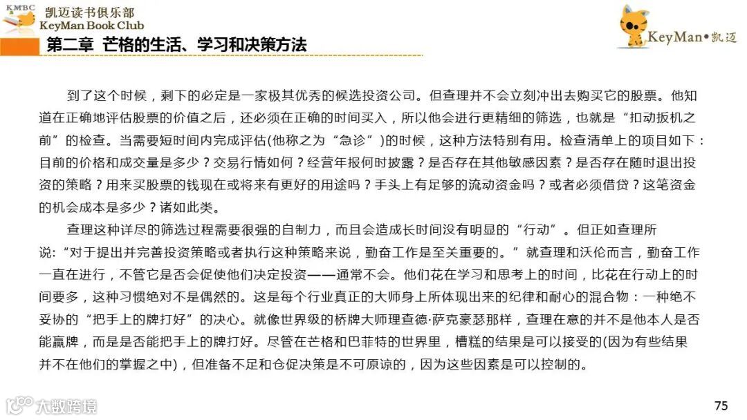 《穷查理宝典》收录了查理过去20年来主要的公开演讲,书中十一篇讲稿全面展现了这个传奇人物的聪明才智。贯穿《穷查理宝典》全书的是芒格展示出来的聪慧、机智,其令人敬服的价值观和深不可测的修辞天赋。