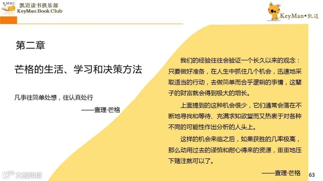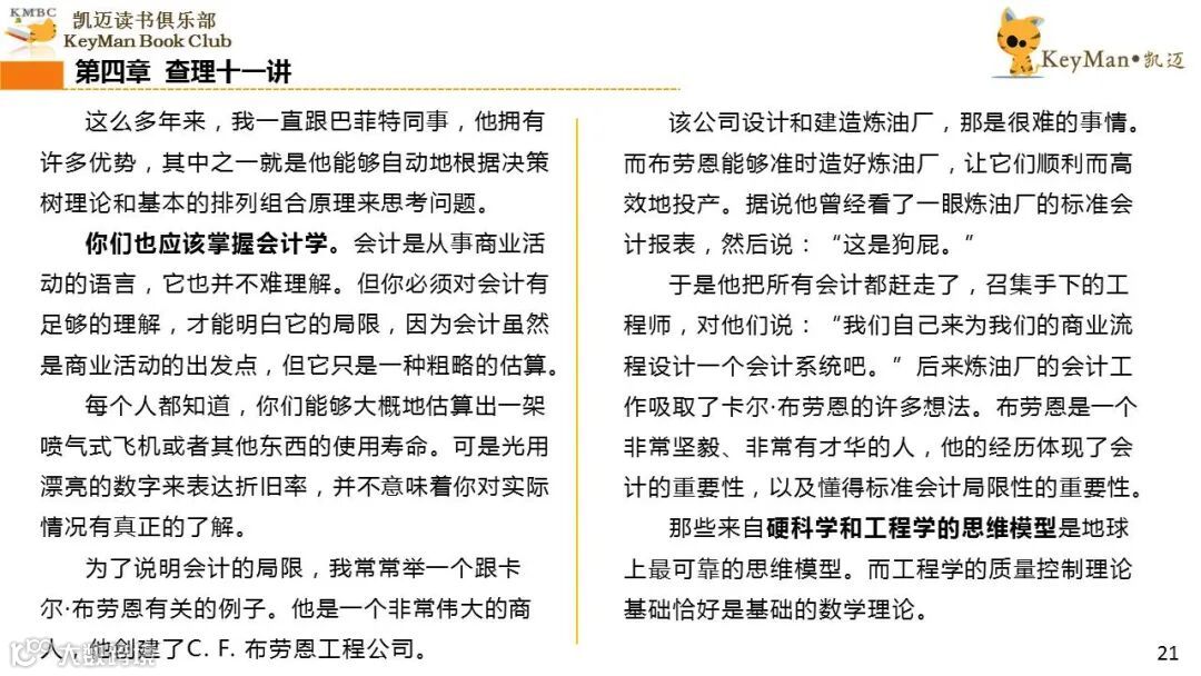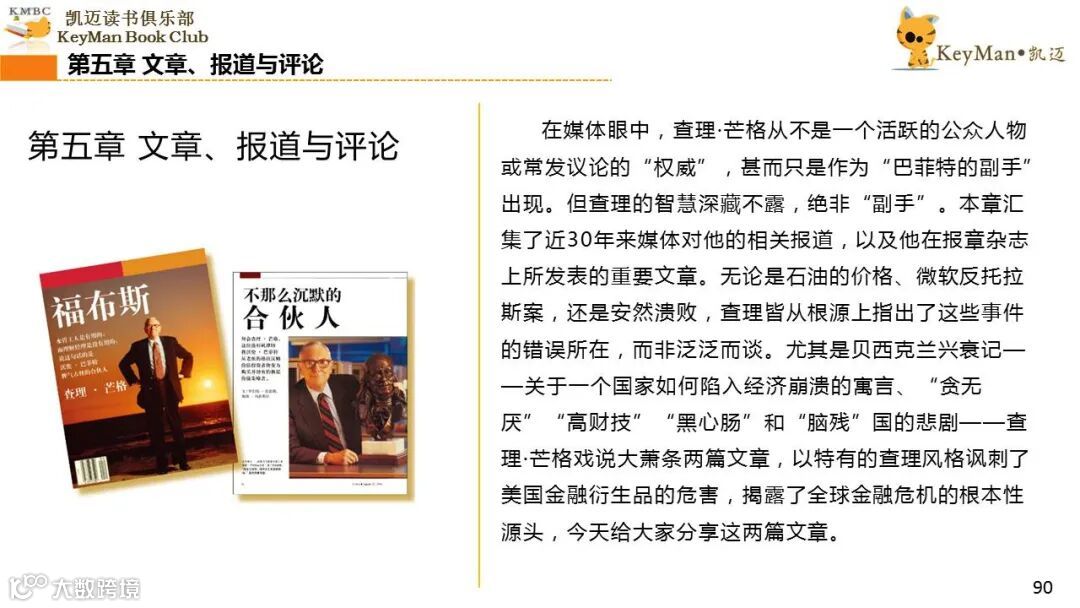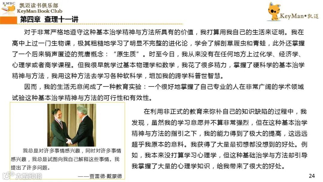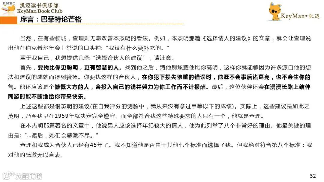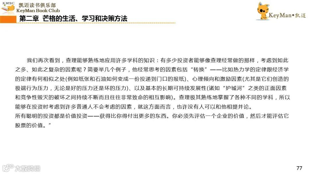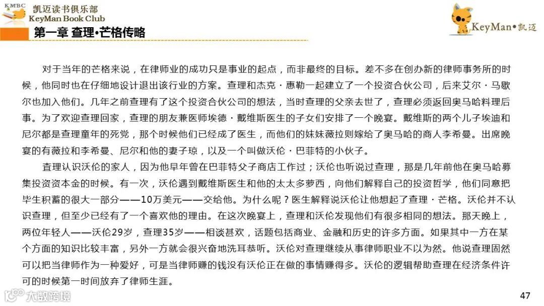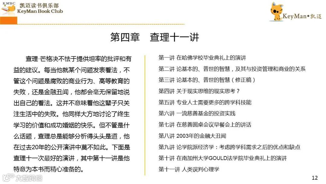 《穷查理宝典》收录了查理过去20年来主要的公开演讲,书中十一篇讲稿全面展现了这个传奇人物的聪明才智。贯穿《穷查理宝典》全书的是芒格展示出来的聪慧、机智,其令人敬服的价值观和深不可测的修辞天赋。