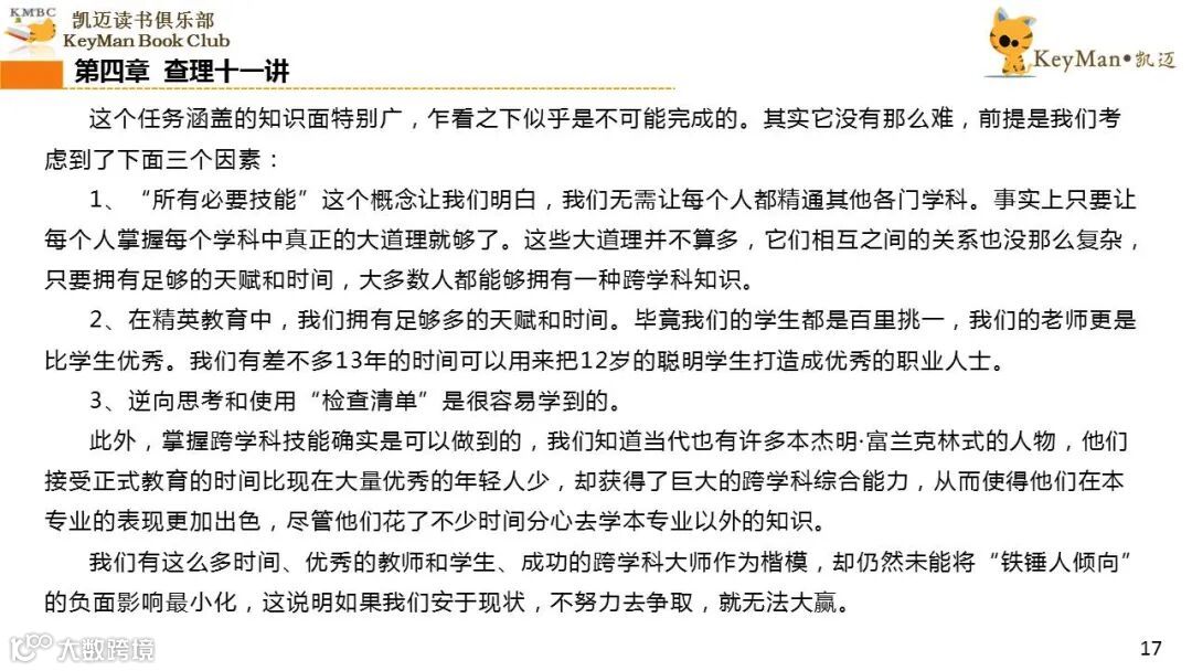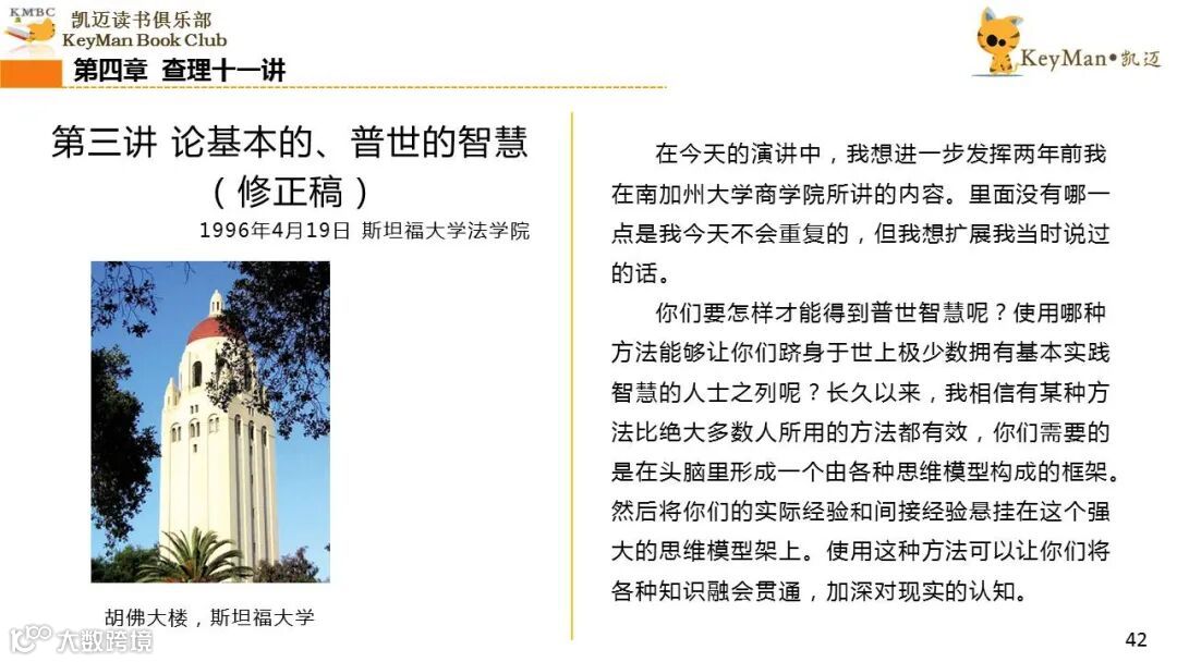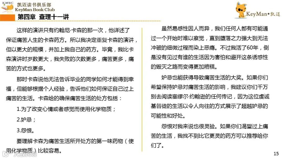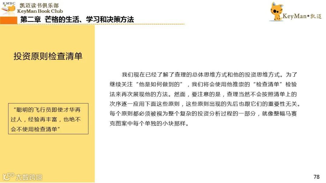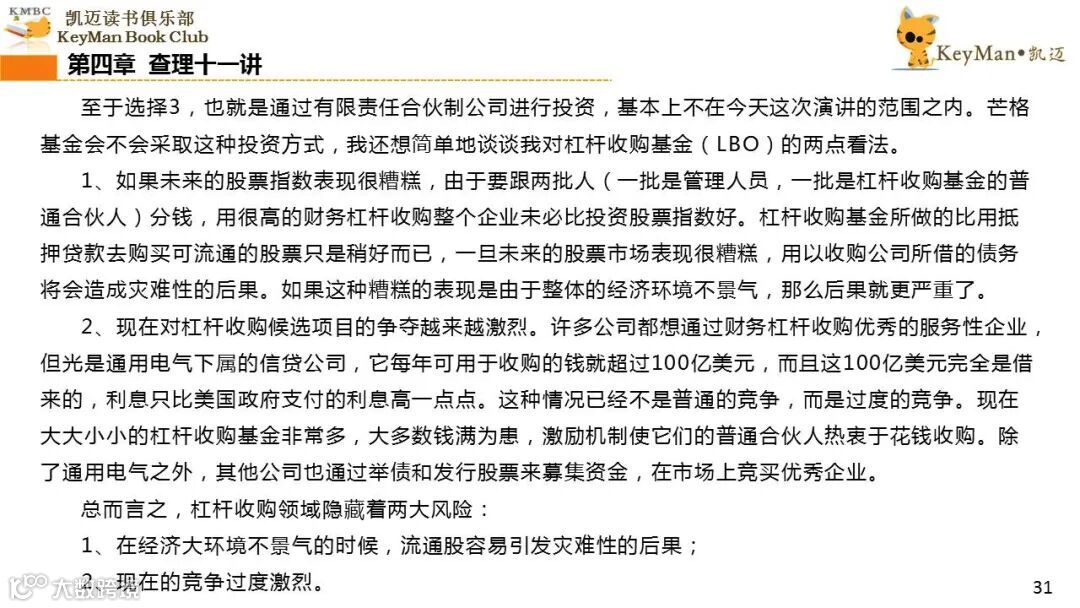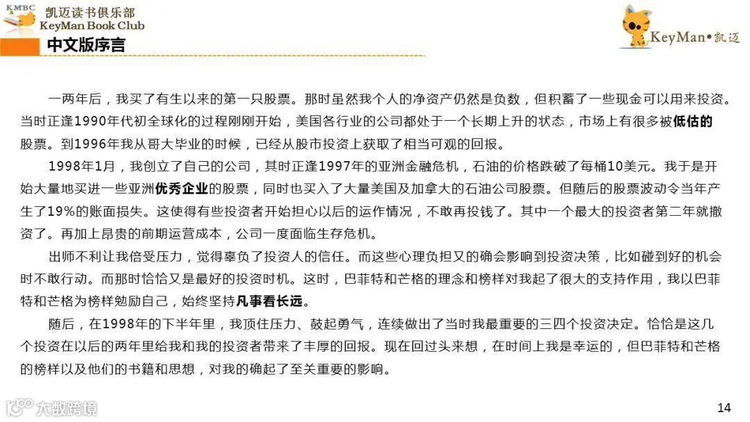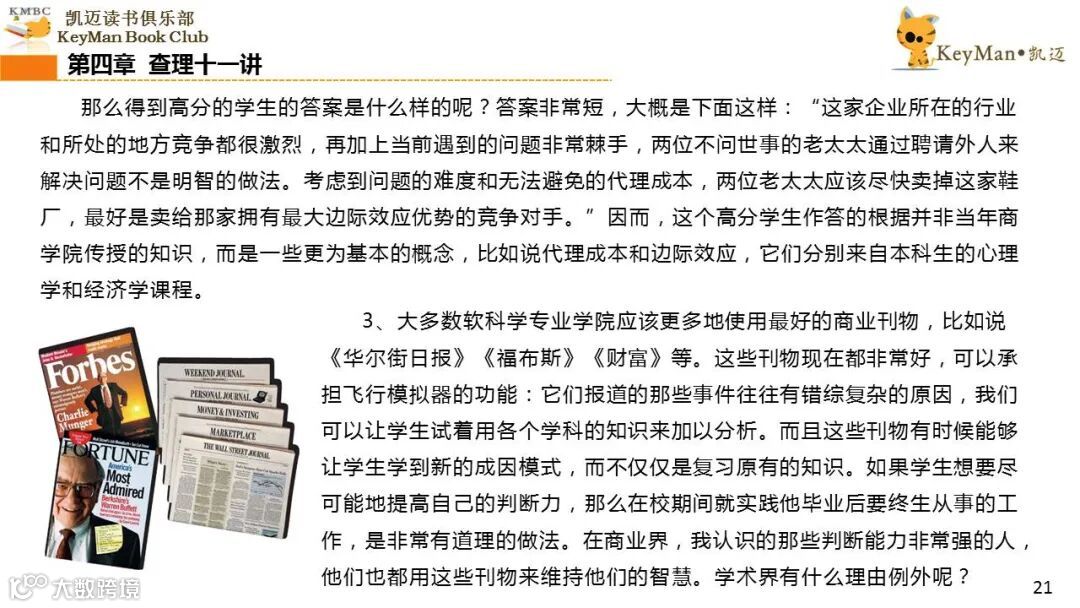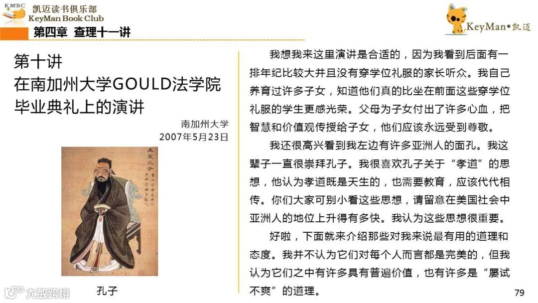 《穷查理宝典》收录了查理过去20年来主要的公开演讲,书中十一篇讲稿全面展现了这个传奇人物的聪明才智。贯穿《穷查理宝典》全书的是芒格展示出来的聪慧、机智,其令人敬服的价值观和深不可测的修辞天赋。
