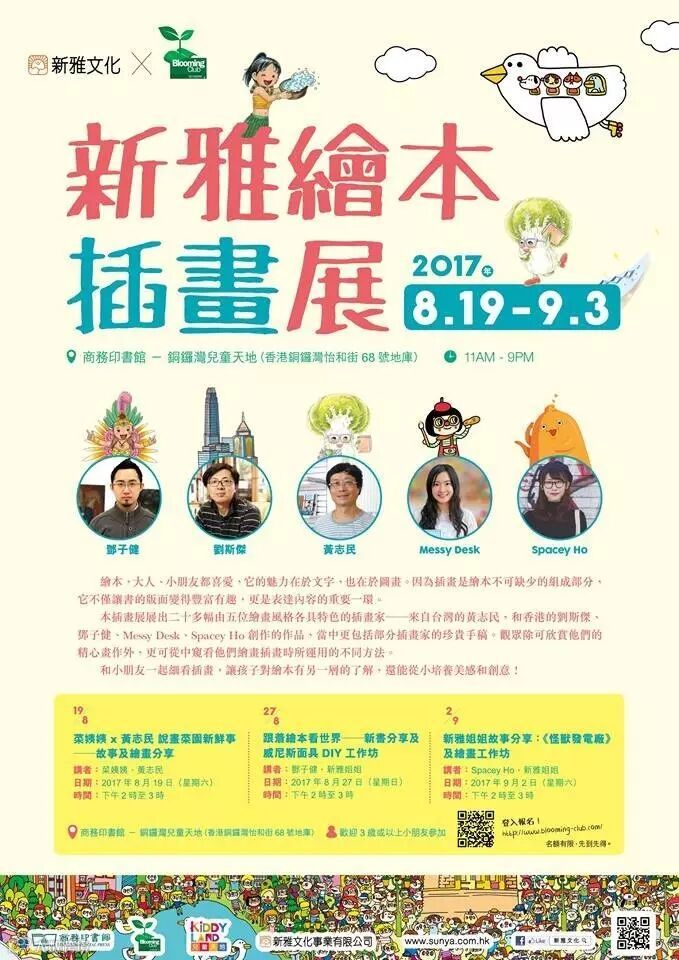 因此,新雅文化和商務Blooming Club特意舉辦「新雅繪本插畫展」,通過展出二十多幅五位繪畫風格各具特色的插畫家——來自台灣的黃志民,和香港的劉斯傑、鄧子健、Messy Desk、Spacey Ho的作品,期望能推動插畫藝術和繪本教育,並培養更多繪本讀者。