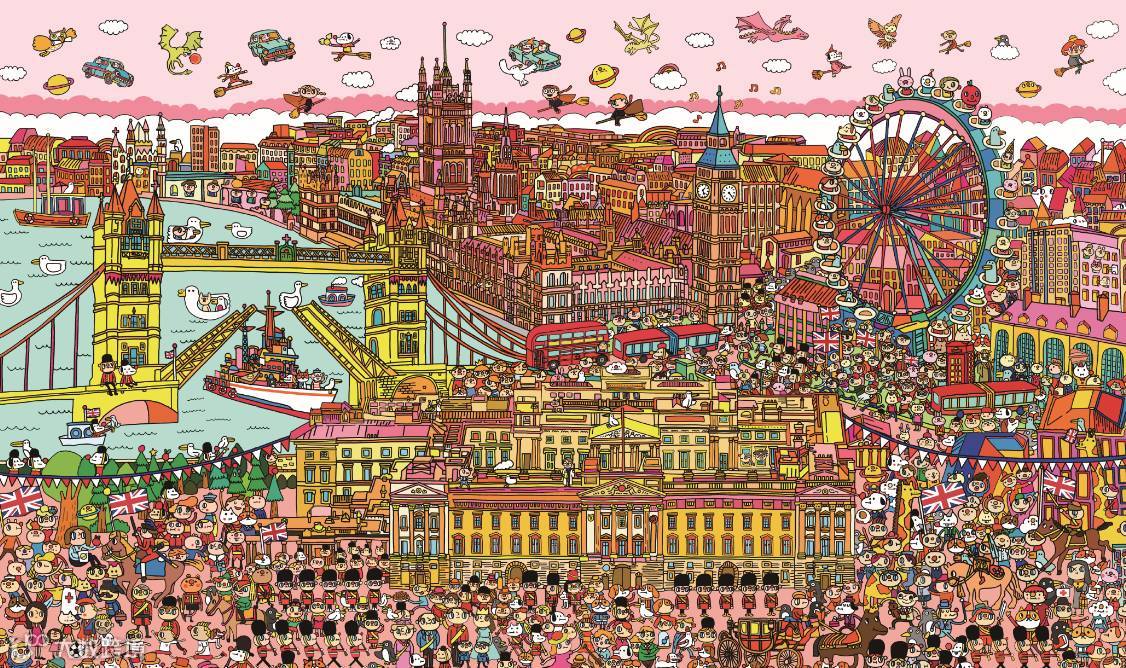 ■ 你能在這幅繪畫英國倫敦的大圖中,找到大衛‧碧咸和他的一家嗎?聽說《哈利波特》的主角哈利、妙麗等都藏在畫中呢!