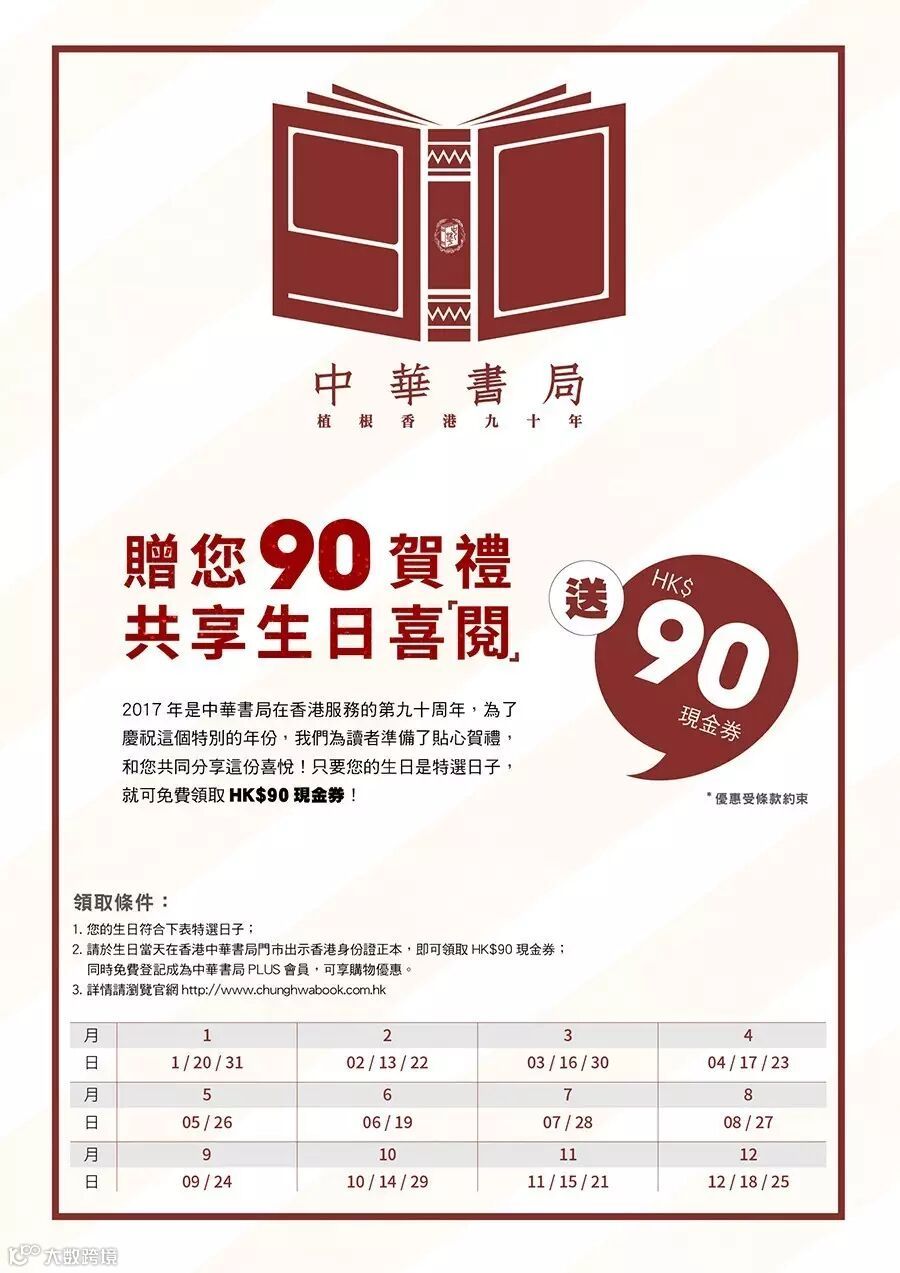 只要您的生日是以下特選日子(最近的是3月30日出生的朋友,請注意了!)歡迎於生日當日,親身到香港中華書局門巿並出示香港身份證正本,即可領取HK$90現金券(使用方法詳見現金券背面使用細則), 讀者還可同時免費登記成為香港中華書局PLUS會員。