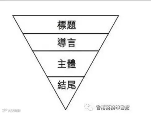 傳統新聞要求記者以「倒金字塔式」寫作,先把最搶眼的關鍵字放在標題(有人甚至嘲笑今日的網絡「標題黨」,以標題吸引受眾進入,但內容欠奉,甚至與題目不配合),再把最重要的資訊放在整篇新聞故事的第一段,然後把補充資料放在下一段,細節則放在故事較後的部分,一如下圖︰