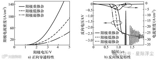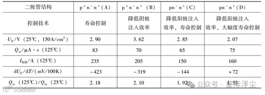 通过控制阳极的掺杂剂量、改变阳极结构,或采用少子寿命控制技术,均可控制阳极或阴极的注入效率,调制其内部的载流子浓度分布,从而获得较软的反向恢复特性和较好导通特性,并使导通压降具有正的温度系数。