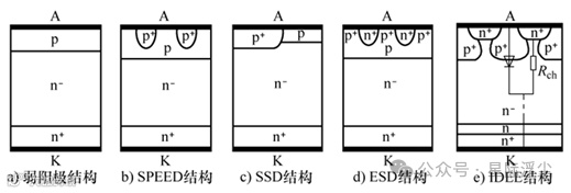 (1)弱阳极二极管结构:如图1a所示,它是通过降低普通 pin 二极管的阳极掺杂浓度形成的。p阳极区的掺杂浓度比普通pin二极管的p+阳极区掺杂浓度更低。采用此结构可降低阳极注入效率,提高反向恢复速度,并降低开关损耗。故这种结构也称为低损耗二极管(Low Loss Diode,LLD)。
