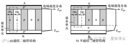 图9 超结与半超结二极管的结构与电场分布示意图