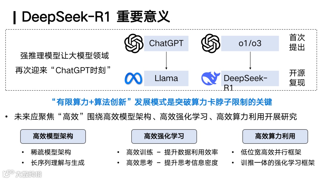 如果说 2023 年初 OpenAI 发布的 ChatGPT 让全球看到了大模型非常重要的价值,那么这一次的强推理能力其实也是 OpenAI 在 2024 年 9 月发布的 o1 率先实现的。而 DeepSeek R1,我们认为它在历史上更像是 2023 年 Meta 的 LLaMA。它能够通过开源复现,并且把这些事情全部公开给全球,让大家能够快速地建立起相关能力,这是我们对 DeepSeek R1 及其重要意义的一个准确认识。