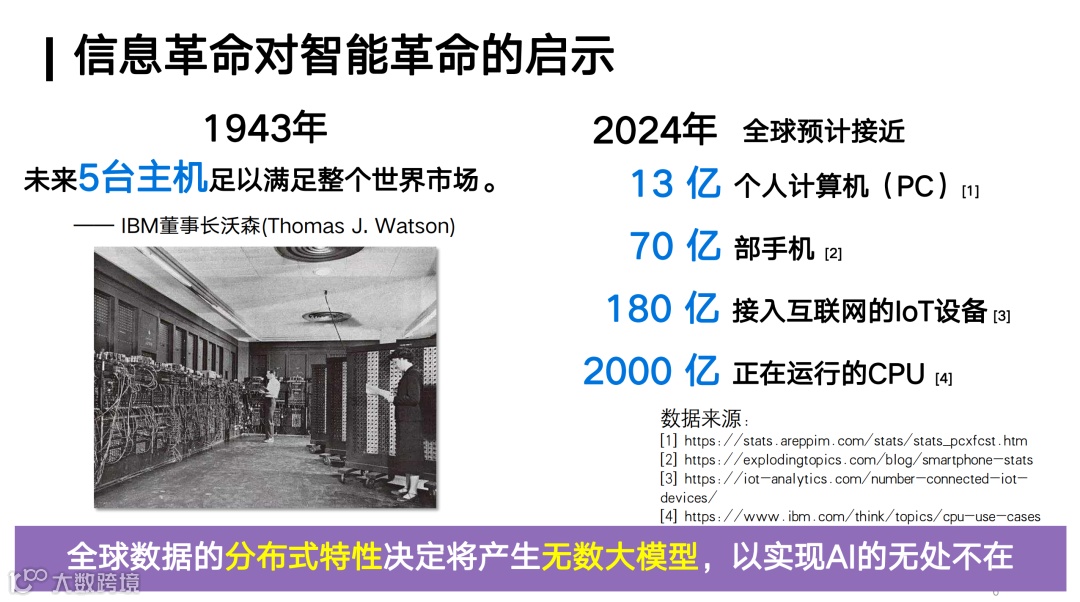 所以,如果我们对标上一个科技革命——也就是信息革命,显然对我们即将到来的智能革命有着非常重要的启示。实际上,在信息革命刚刚开始的时候,IBM 的创始人沃森曾认为,世界上不需要超过五台主机就可以满足全世界的计算需求。但到了今天,我们可以看到全球有数十亿、上百亿的计算设备在服务于全人类社会。