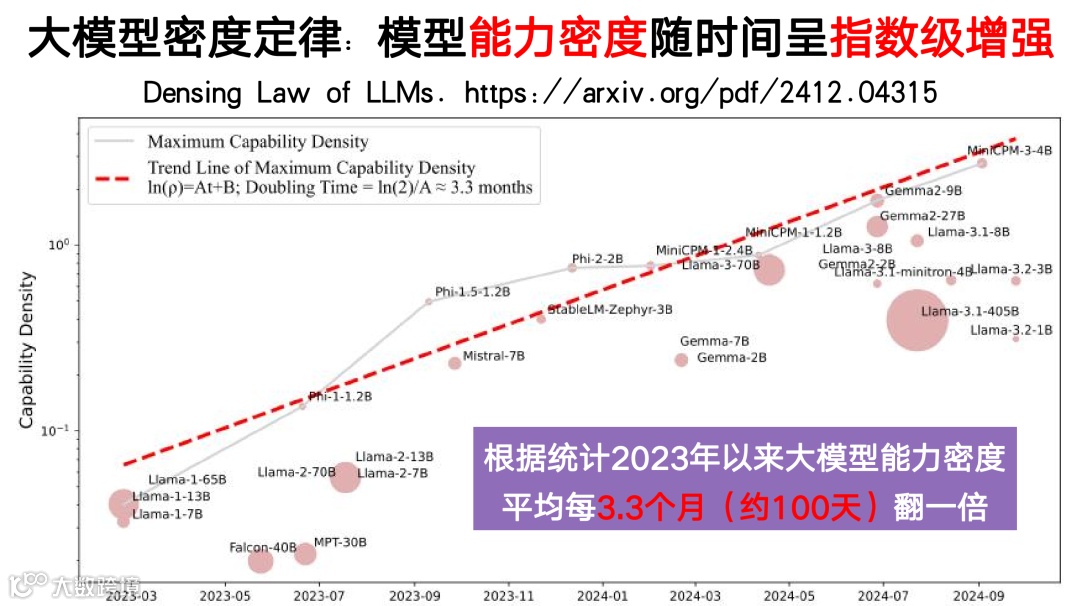 实际上,过去几年我们也能看到类似摩尔定律的现象:大模型的能力密度正以时间的指数级增强。从 2023 年以来,大模型的能力密度大约每 100 天翻一倍,也就是说,每过 100 天,我们只需要一半的算力和一半的参数就能实现相同的能力。
