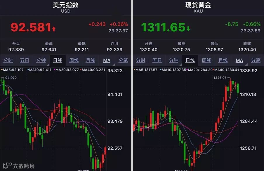 7、【美元指数、现货黄金】截至2018-01-09,23:37