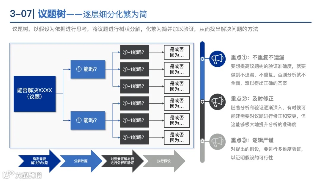 逻辑树:将问题拆解为“ What(具体化)、Why(找原因)、How(找方法)”三类子问题,确保分析有条理。