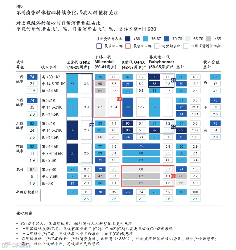 同时,报告中细分了5类群体的消费信心与情绪,非常值得品牌深入研究。这5类人群包括:城镇Z世代(单身学生、普通职员居多)、一线富裕银发族、三线富裕中老年、一二线新中产(高学历的外地人居多),以及农村中老年。