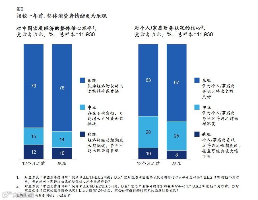 麦肯锡近期公开发布了《2024中国消费趋势调研》,我们从11930份全面覆盖一至四线城市及农村地区的调研数据中得知,2/3受访者的消费情绪相较前一年更为乐观。