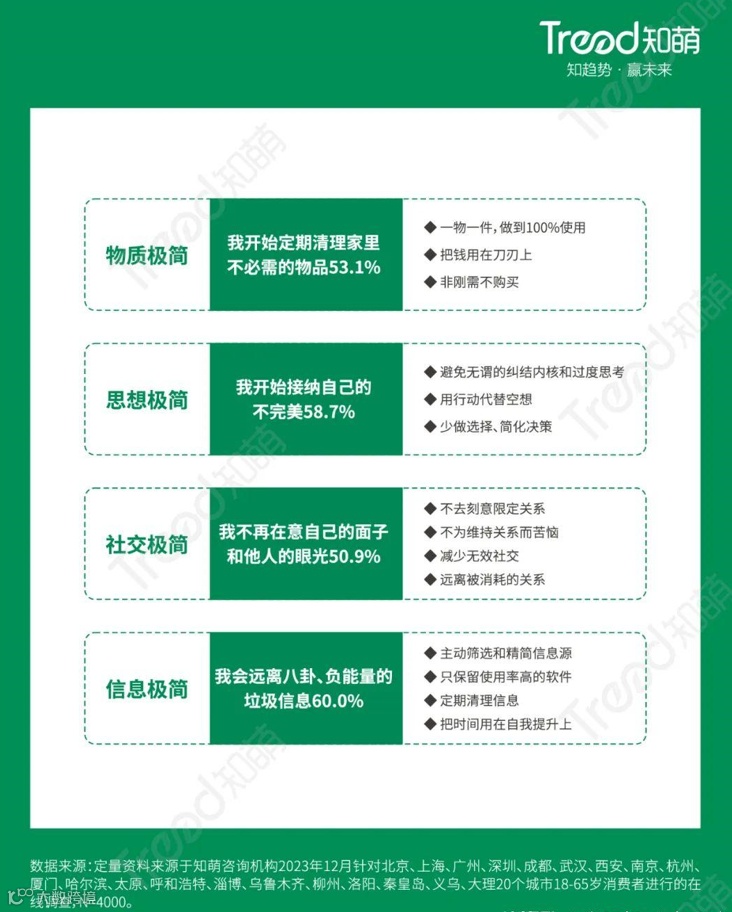 知萌2024年中国消费趋势调研显示,超负荷忙碌的生活令很多消费者开始思考通过减少物质需求、降低生活节奏,使生活变得更简单、更有品质。消费者开始在物质、思想、社交、信息等方面全面减负,践行极简的生活方式。60.0%的消费者开始远离八卦、负能量的垃圾信息;58.7%的消费者开始接纳自己的不完美;53.1%的消费者开始定期清理家里不必需的物品。