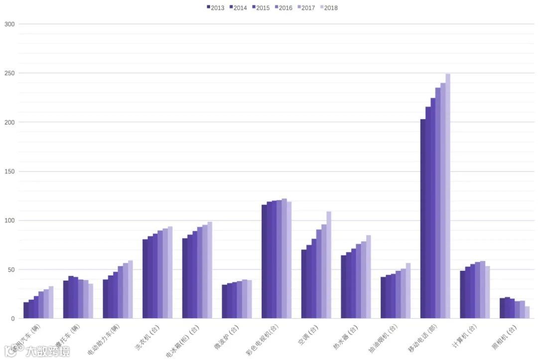 2013年-2018年期间,全国居⺠每百户洗⾐机、电冰箱、电视机、空调、汽⻋等多个品类的耐消品拥有量持续提升。
