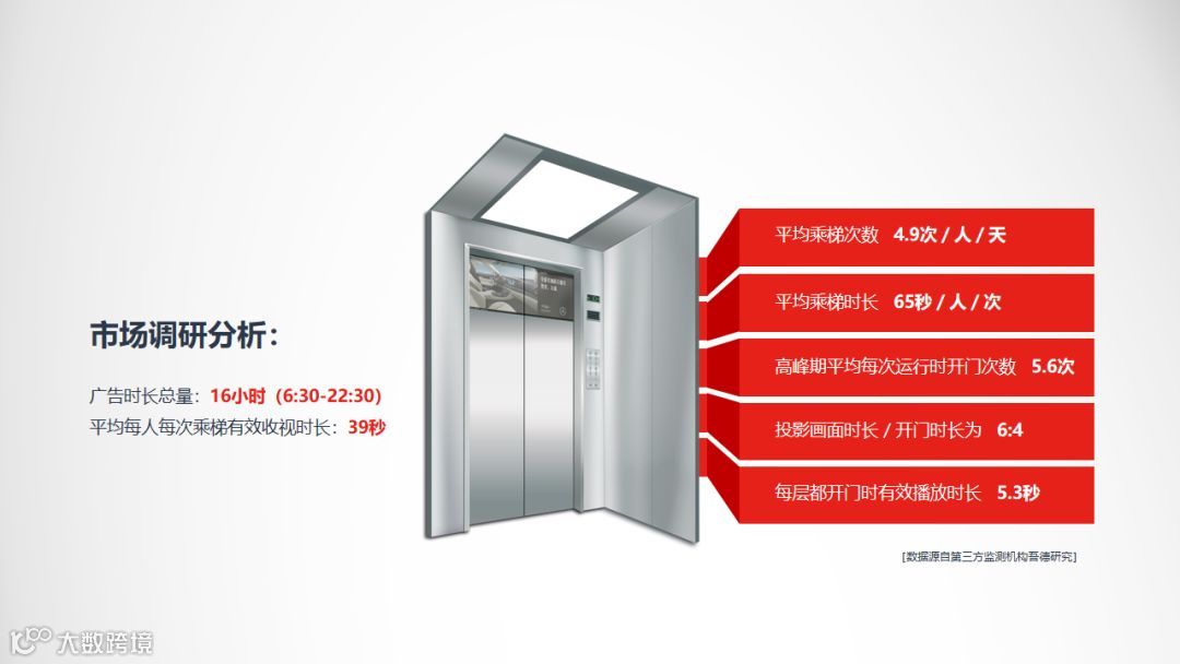 快到自己的目标楼层时,则会聚精会神地看向电梯门一侧,梯影媒体上播放的广告就像春晚或新闻联播开始前的倒计时,在等门打开的前几秒,人们的注意力处于“高唤醒”状态,实际收视效果显而易见。