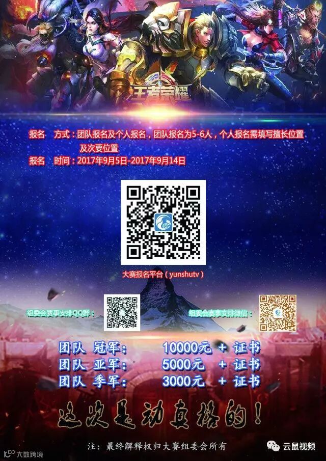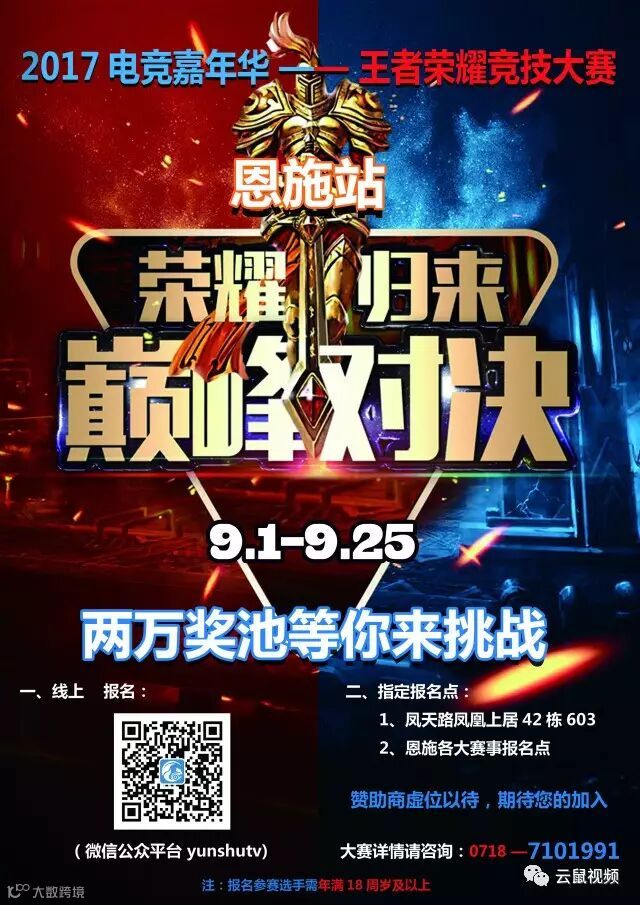 报名方式:微信搜索关注:云鼠视频,点击报名“2017世界硒都首届电竞文化节暨王者荣耀竞技大赛”
