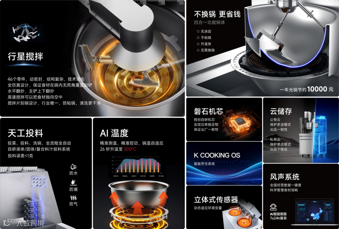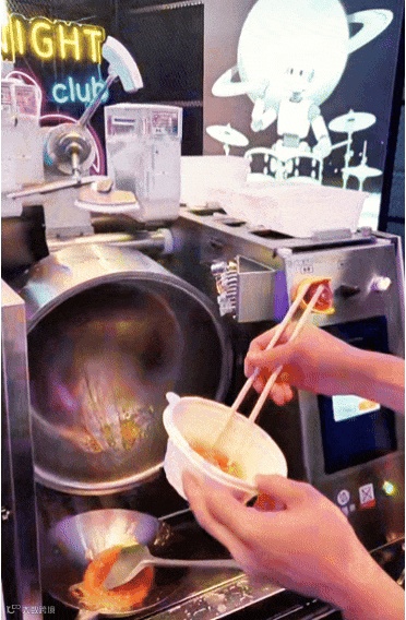 橡鹿机器人品牌部肖海燕介绍:“把相关的净菜放入机器,厨师只需两个动作——点‘开始炒制’和炒制完成后的装菜、出菜,中间过程全自动化,餐厅和大厨掌握菜谱秘方,机器人主打复刻大厨手艺,同时菜谱实现一键下发,以保障连锁餐厅出品品质的一致性。也就是八大菜系,不同餐饮类型所需的菜谱在这台设备上都能1:1复刻出来。”目前中国有1000多个餐饮品牌已经投入使用这款机器人。”
