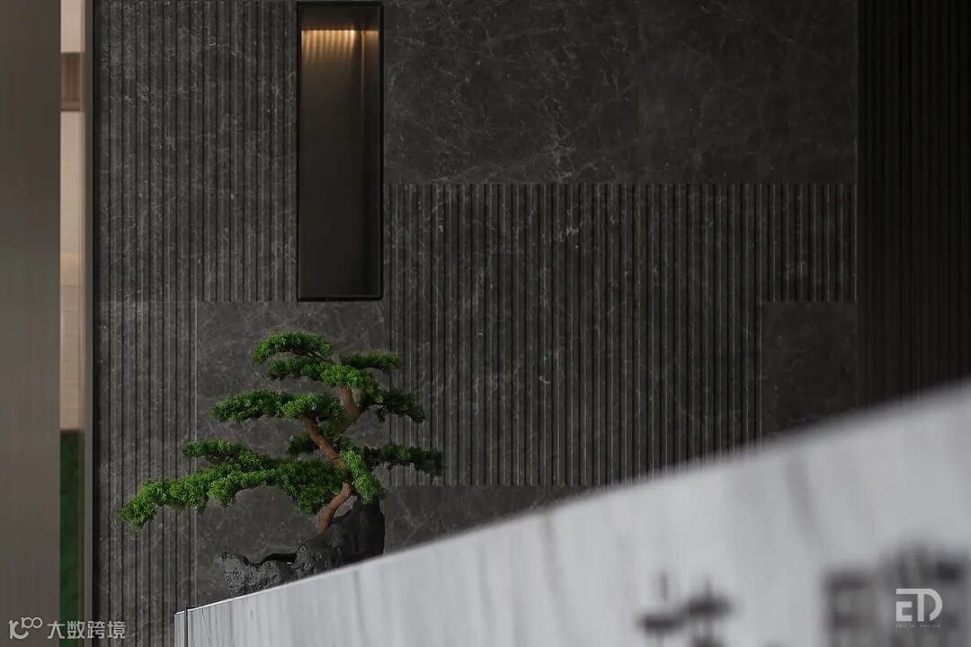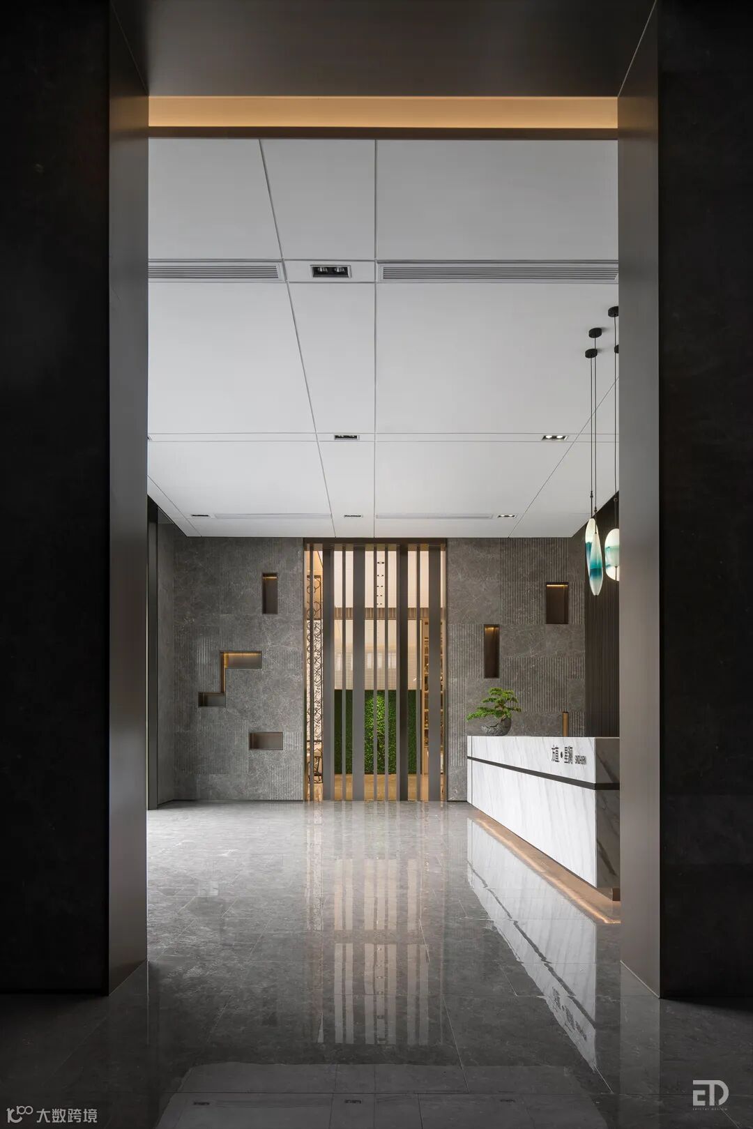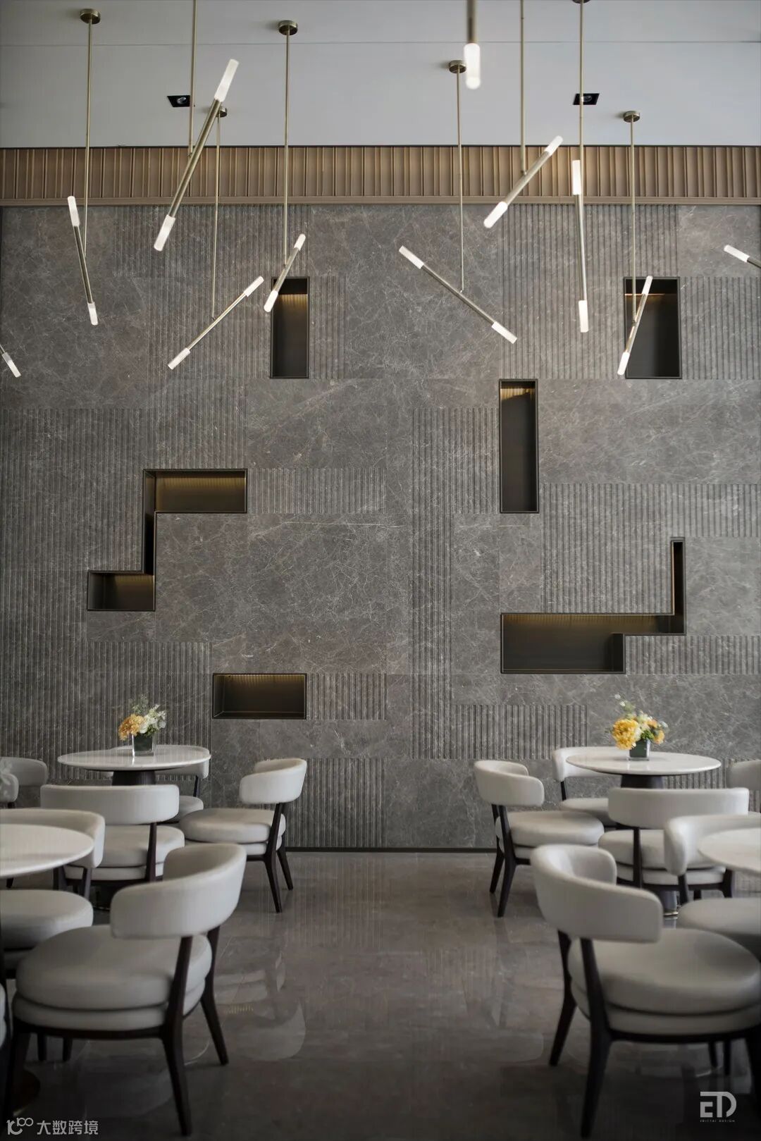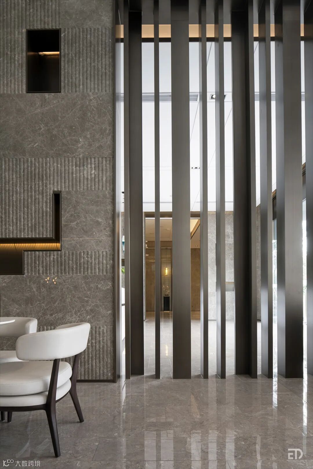 几何镂空的墙面设计为空间增添通透的空气感,看似对称的空间隐藏着不对称的细节刻画。洽谈区置入灰白主调,轻盈的视觉牵引出宁静自然的意象;雅致的金属与细腻的肌理,以质朴的外在渲染独具特色的空间韵律,端雅闲适中兼具美学内涵。