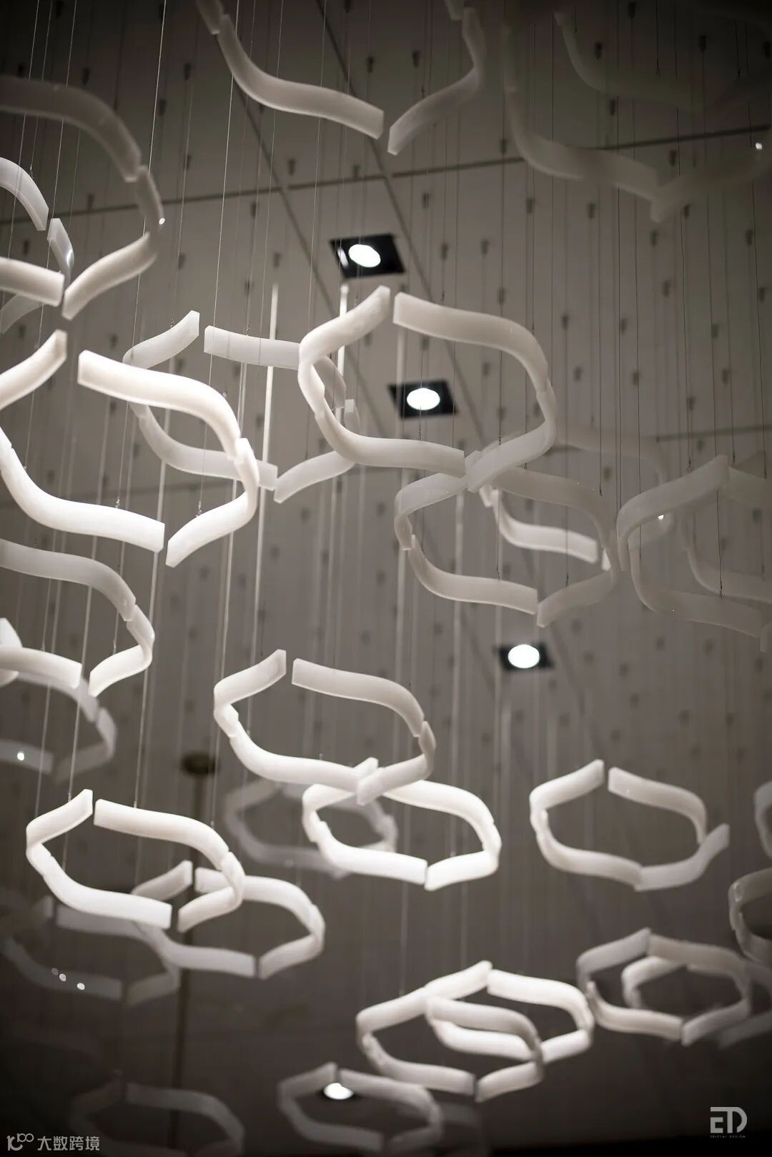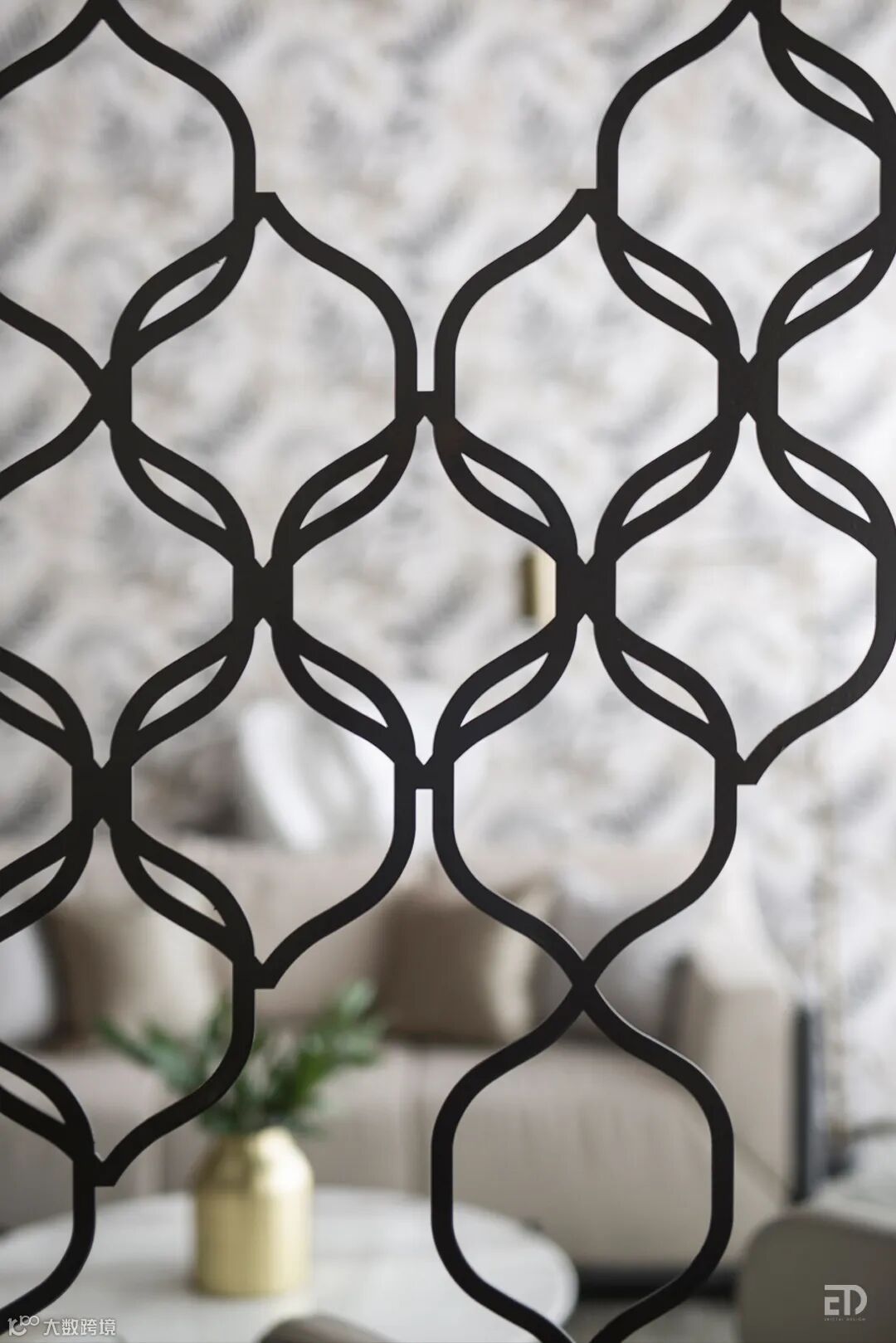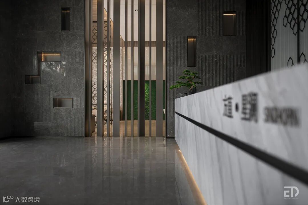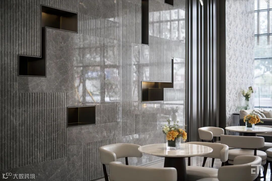 几何镂空的墙面设计为空间增添通透的空气感,看似对称的空间隐藏着不对称的细节刻画。洽谈区置入灰白主调,轻盈的视觉牵引出宁静自然的意象;雅致的金属与细腻的肌理,以质朴的外在渲染独具特色的空间韵律,端雅闲适中兼具美学内涵。