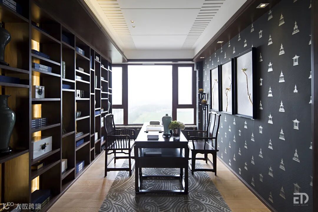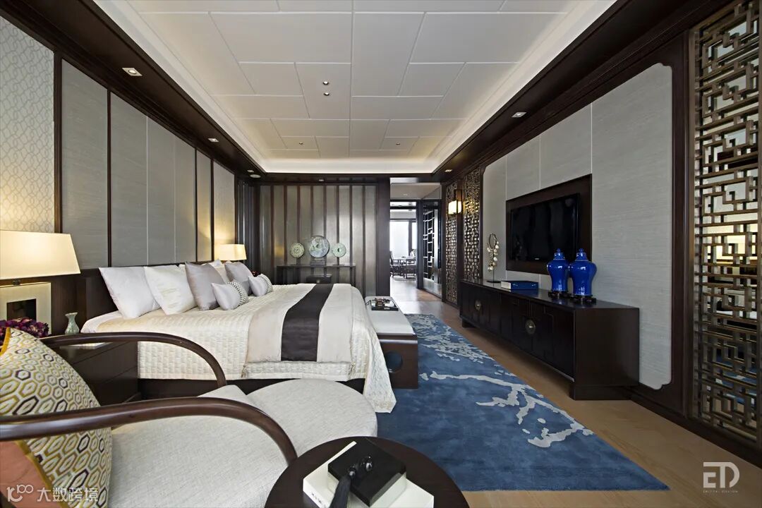 本案的色彩选用了紫檀色、黛蓝色与金色的色彩组合,营造尊贵典雅的色彩氛围。门厅地面用土耳其金镶玉及希腊雅士白云石拼出传统的海棠图案,硬装选用紫檀色的铁刀木、珍贵的真丝布艺硬包、进口中国图案壁纸、传统“万”字纹的玫瑰金不锈钢屏风、浮雕面木地板等物料。多处出现的海棠角装饰细节也成为室内装饰的特色元素,不仅体现在硬装上,在专门定制的家具上也出现了此细节的呼应。洗手间墙面选用了意大利太白玉云石,铺贴方式采用中国传统的工字拼法,地面用土耳其科莫灰石材衬托,洗手台和化妆镜的设计借鉴了中国传统建筑和家具的装饰元素,洗手台面选用了河南当地产的紫砚石做台面。