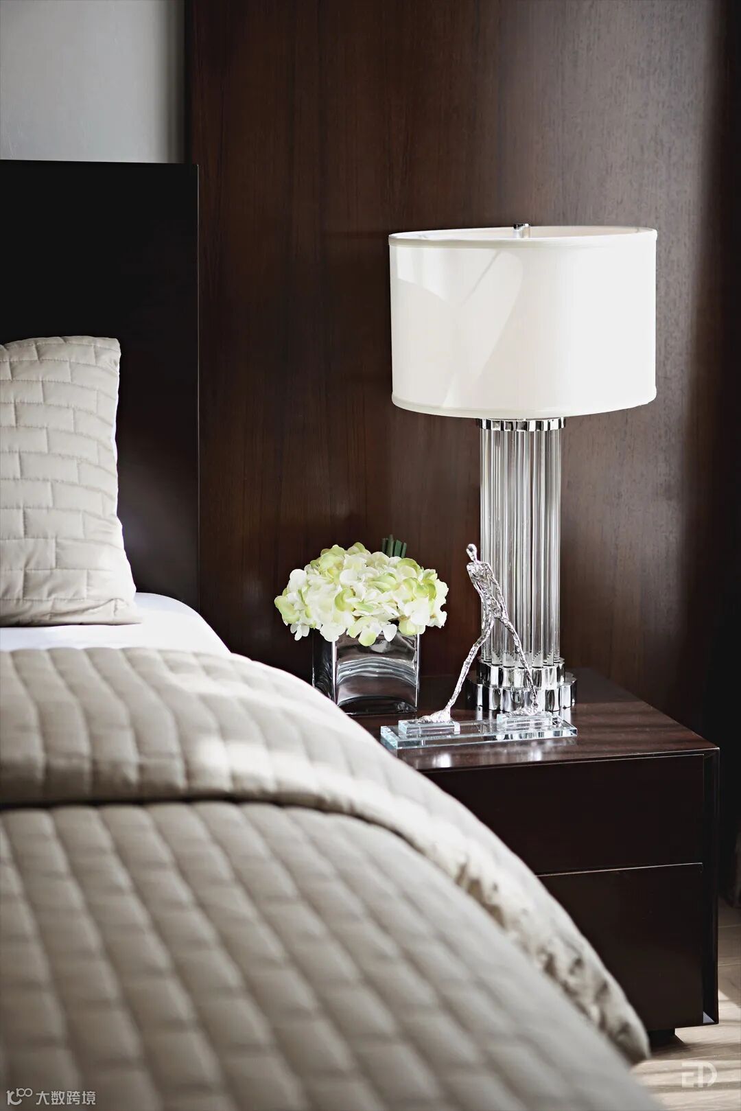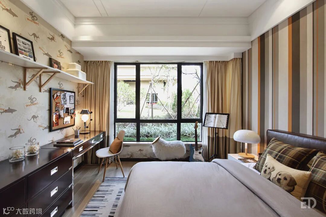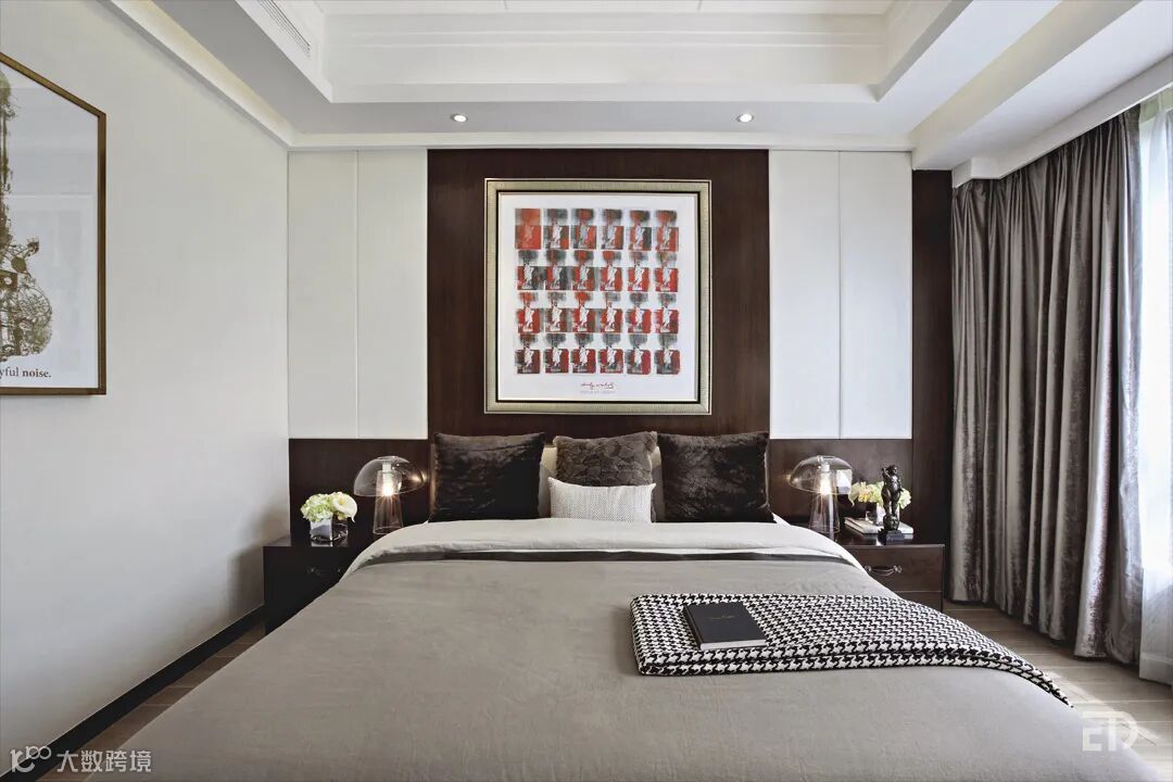卧室以深色胡桃木、米白色皮革硬包及墙纸作为墙面主要材质,简洁稳重,对比鲜明。设计师利用软装来提升空间的艺术格调,波普挂画是时尚的,仿毛皮抱枕是自然的,玻璃台灯是轻盈的,青铜雕塑摆件是厚重的,对比和协调,都在细节中。