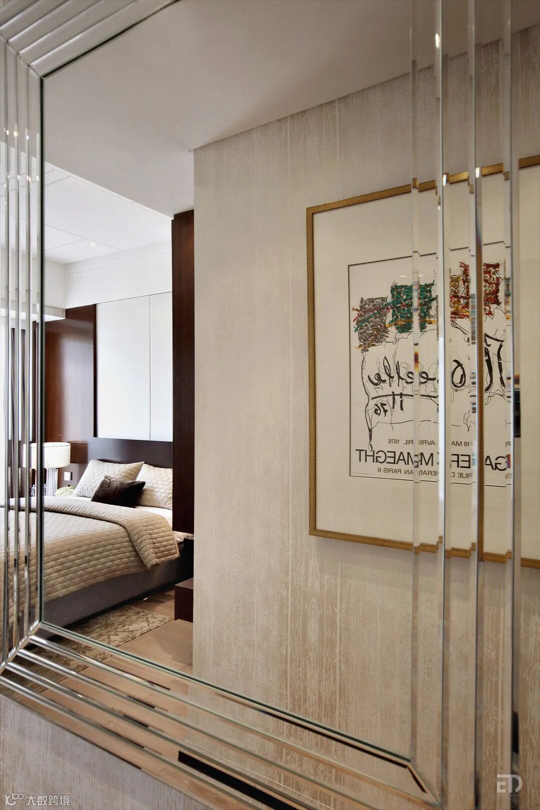 进卧室的走廊挂着现代的镜子和时尚的海报,既丰富视觉,又延伸空间。