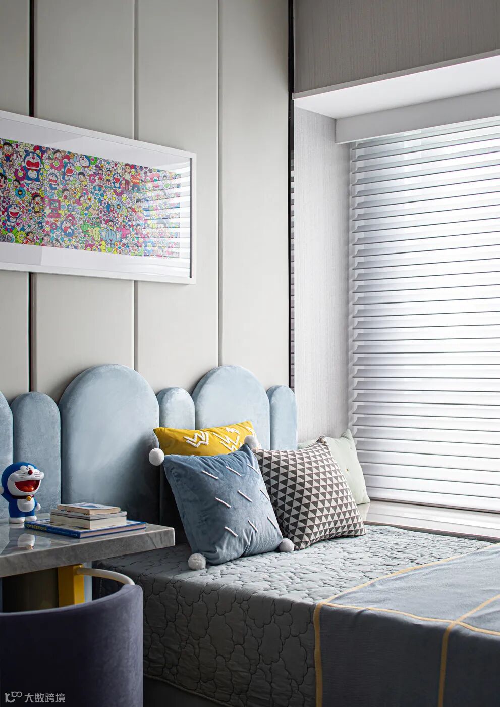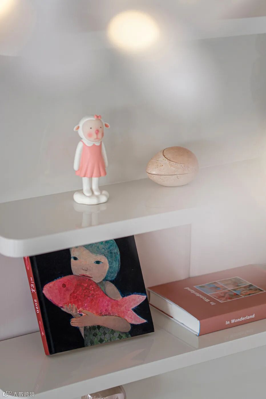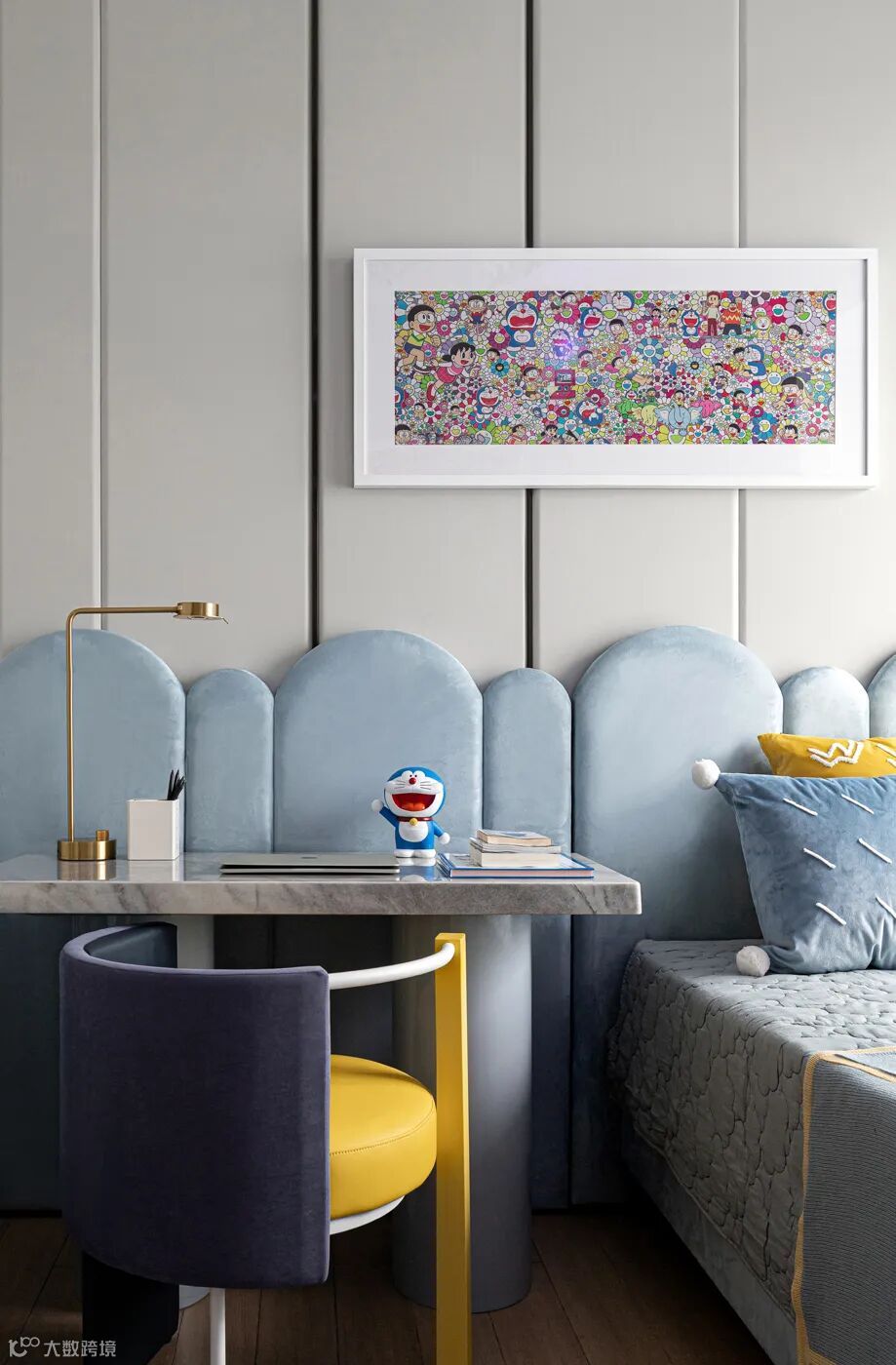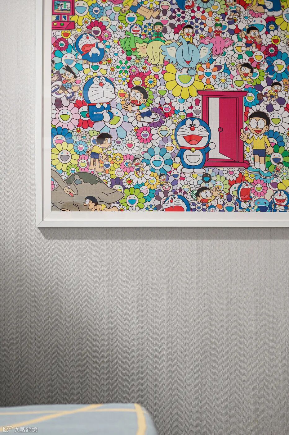 男孩房以机器猫为主题进行设计。房间中的挂画为日本艺术家村上隆的作品。村上隆是战后亚洲最受好评的艺术家之一,其绘画作品融合了东方传统与西方文明,打通了高雅艺术与通俗文化,形成了一种独特的风格。挂画中,机器猫的经典形象配以村上隆最为标志性的太阳花设计,可谓相得益彰。桌上的机器猫玩偶,正亲切地向孩子招着手。