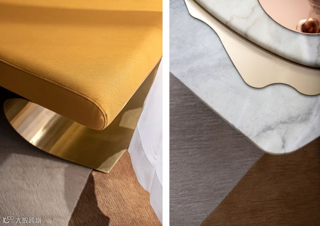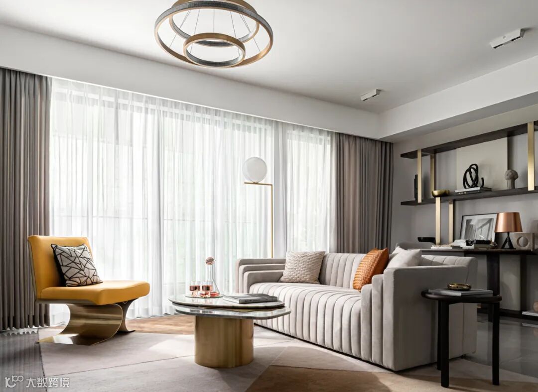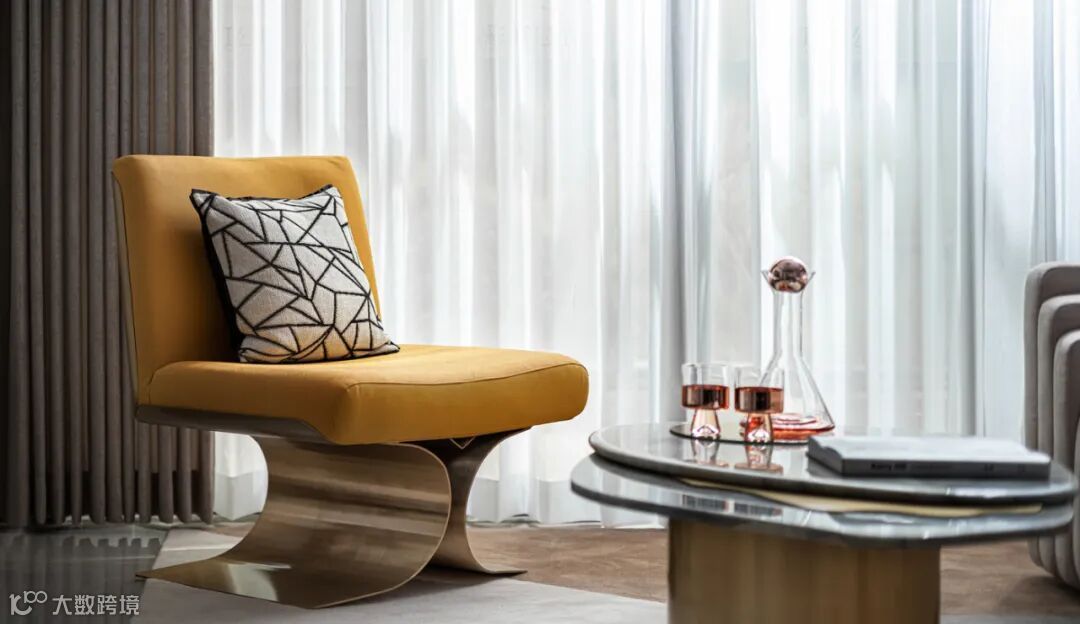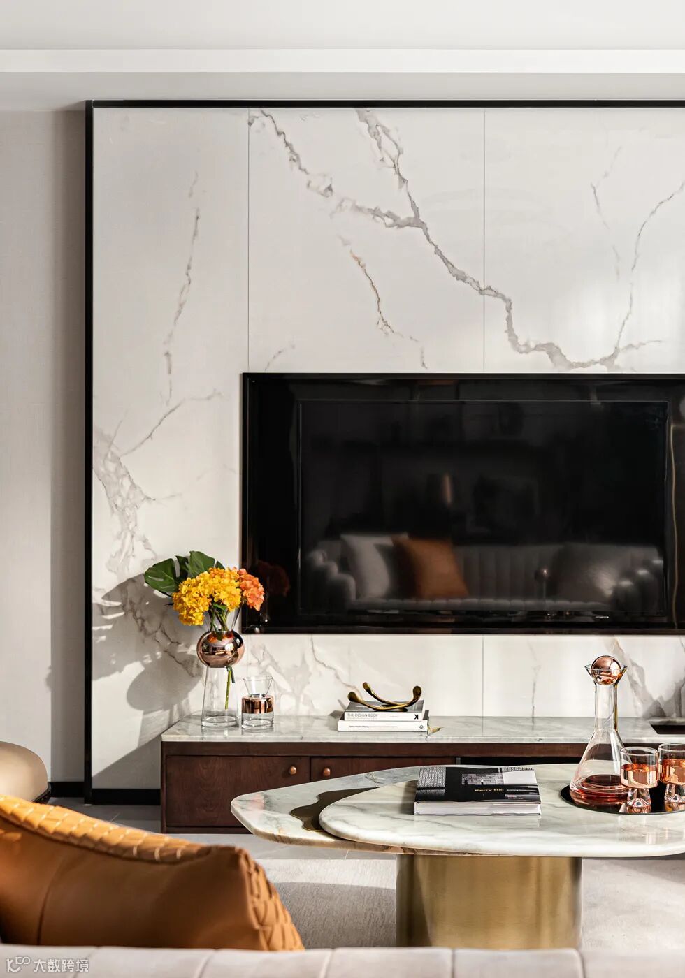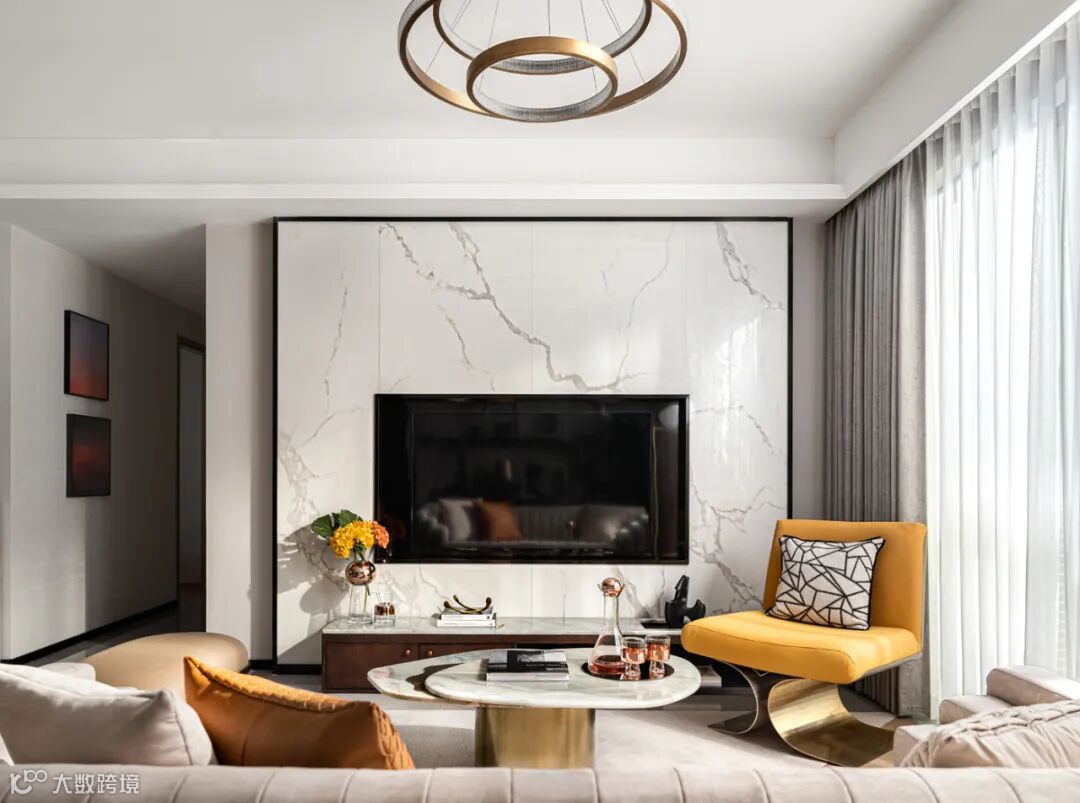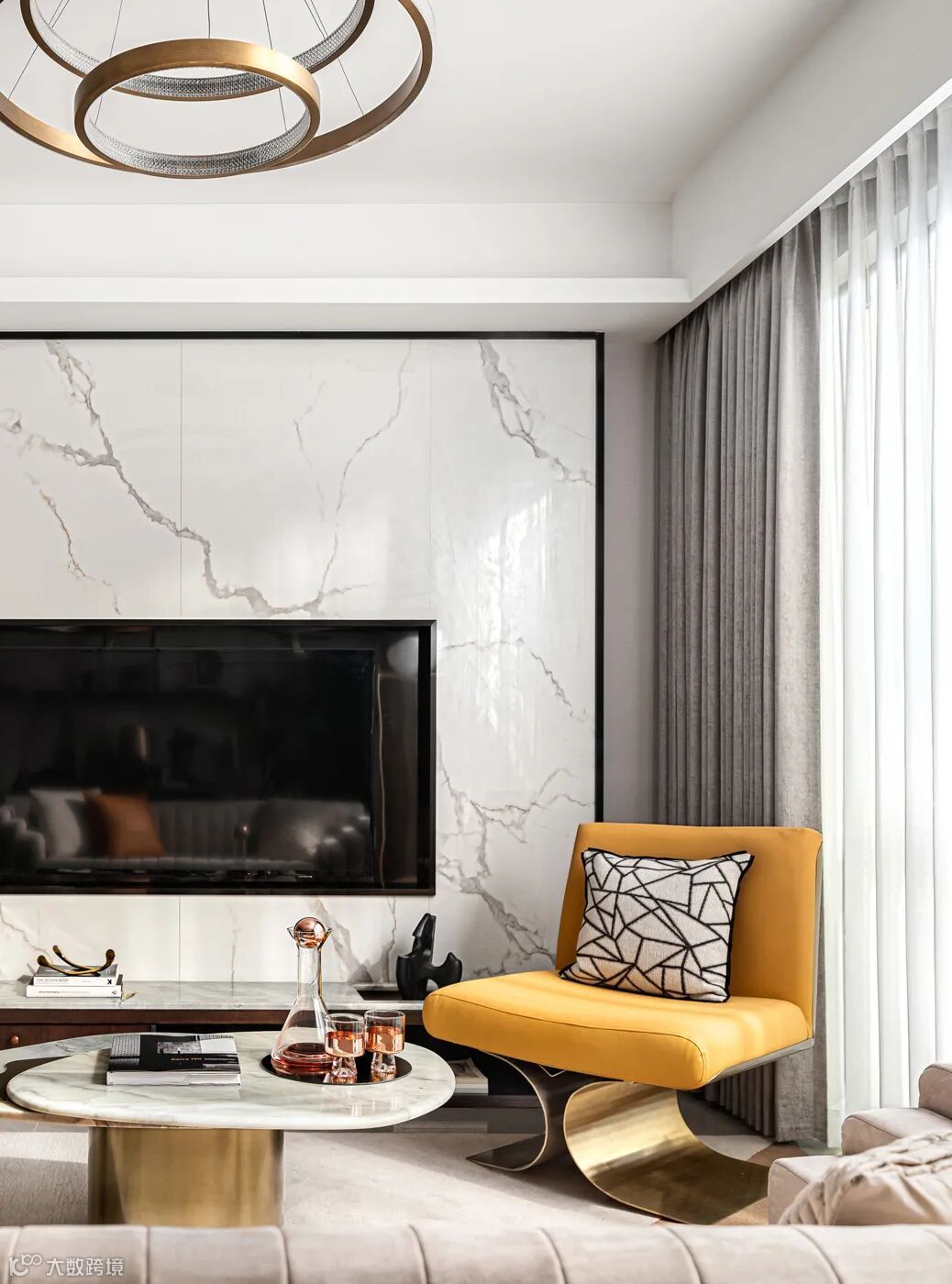 电视区域以一种温婉、舒适的形态展现在我们眼前。黄色的休闲椅和橙啡色的编织皮靠枕显得灵动而又活泼,色彩在空间中自由地跃动,与背景形成了一种反差美。休闲椅及茶几底座部分的金属独具轻奢感,客厅整体的气质由此变得更有质感。