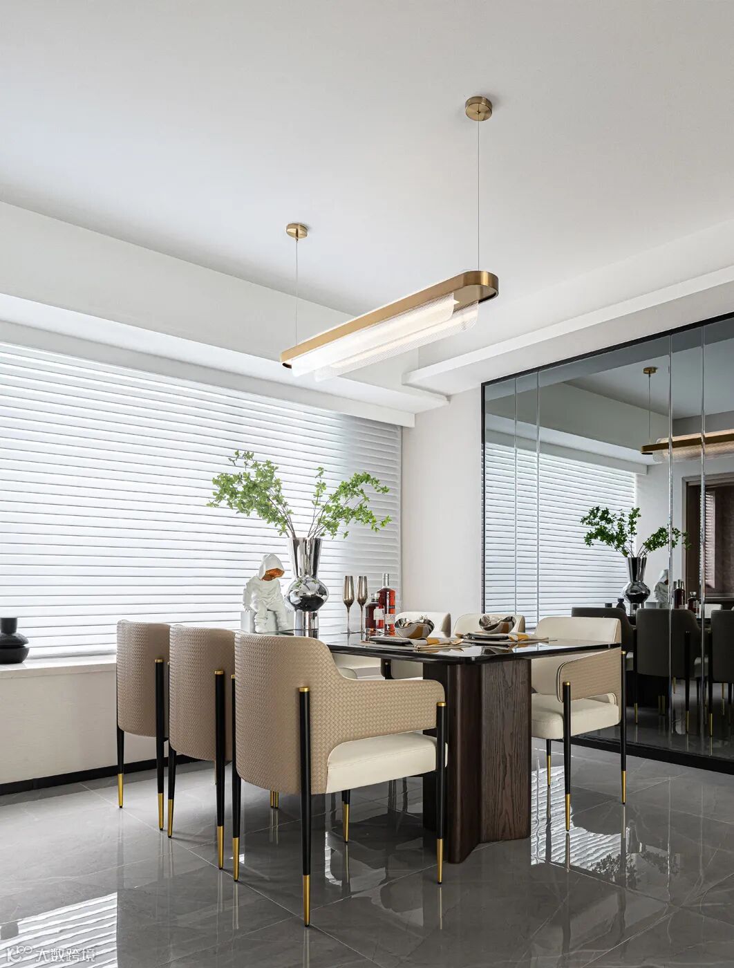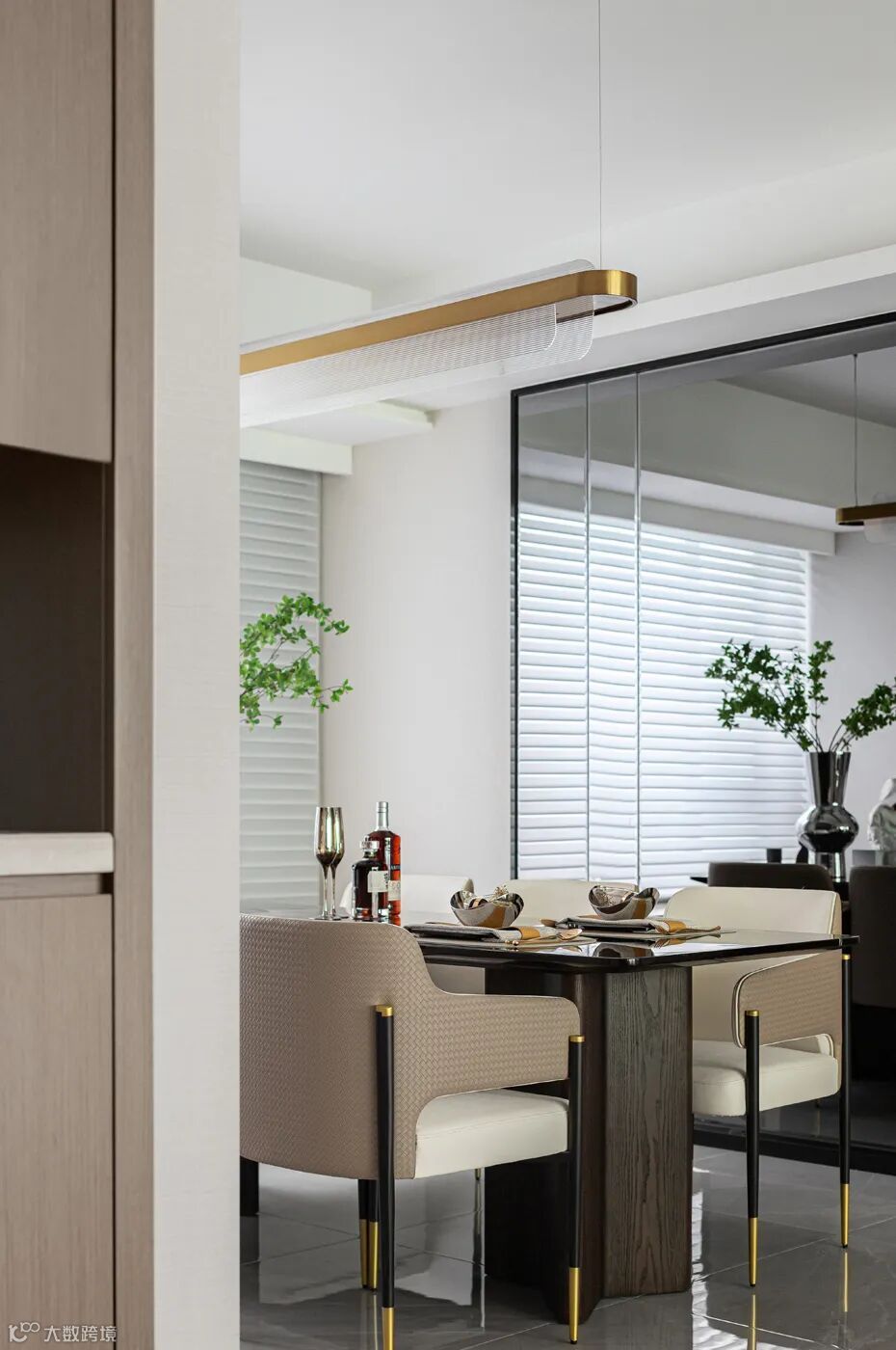 戴勇设计研究室受邀为中山方直彩虹公馆打造最新推出的展示样板间。本户型为四居室单位,独立的就餐区让空间更有专属性。餐厅主墙面的镜面处理延伸了空间,并更多地引入了光线。软装部分搭配精致的家具和简洁的灯具,简约并富有细节。