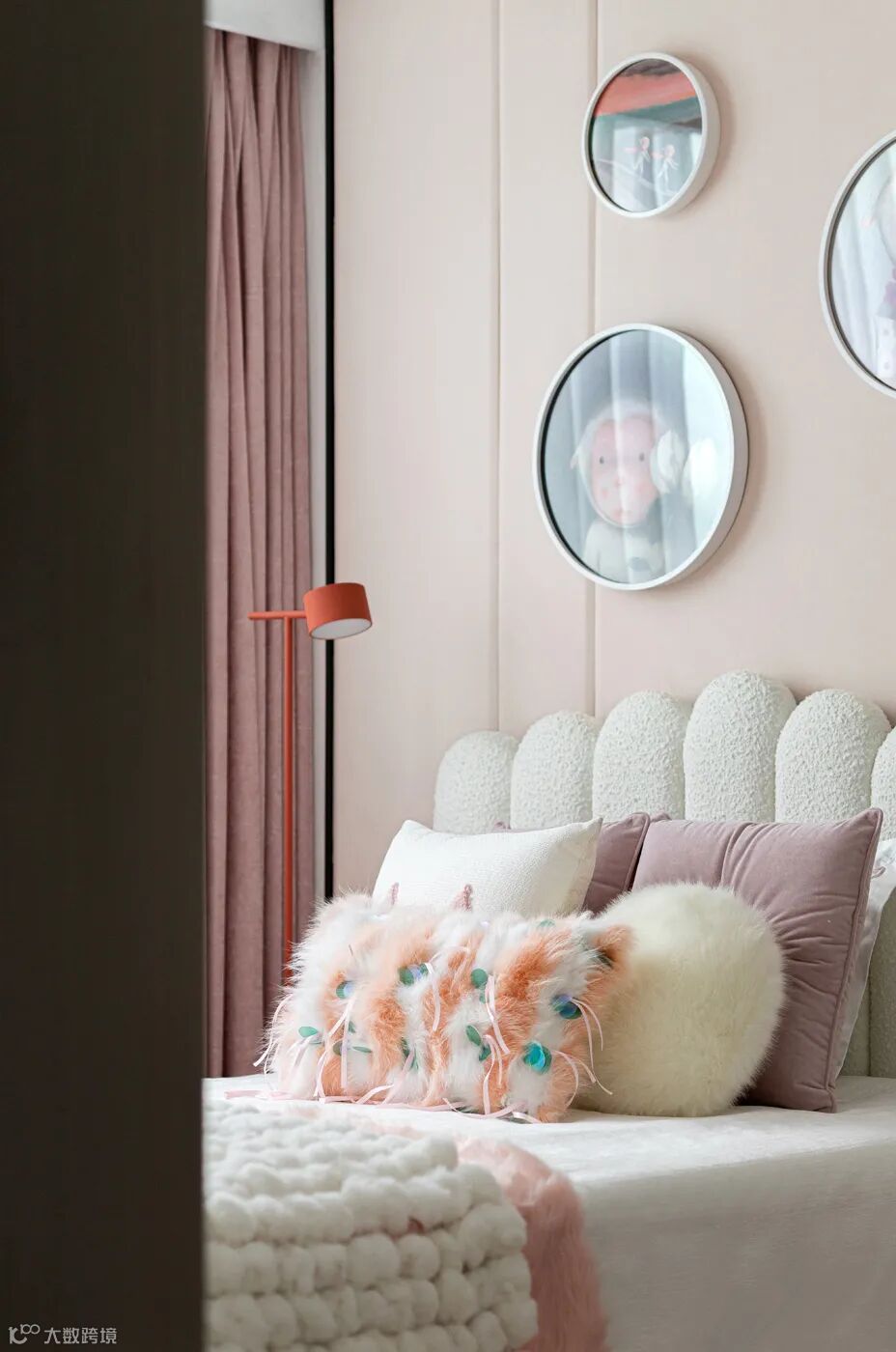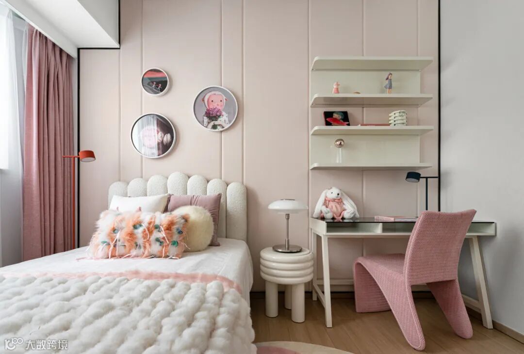 走进女孩房,设计风格转向温馨和浪漫。从壁纸、座椅到孩童所喜爱的毛绒玩具,粉红色的元素在房间中随处可见。设计师着力为女孩打造了一个温情而舒适的生活环境,使她能够在这里自由自在地成长。